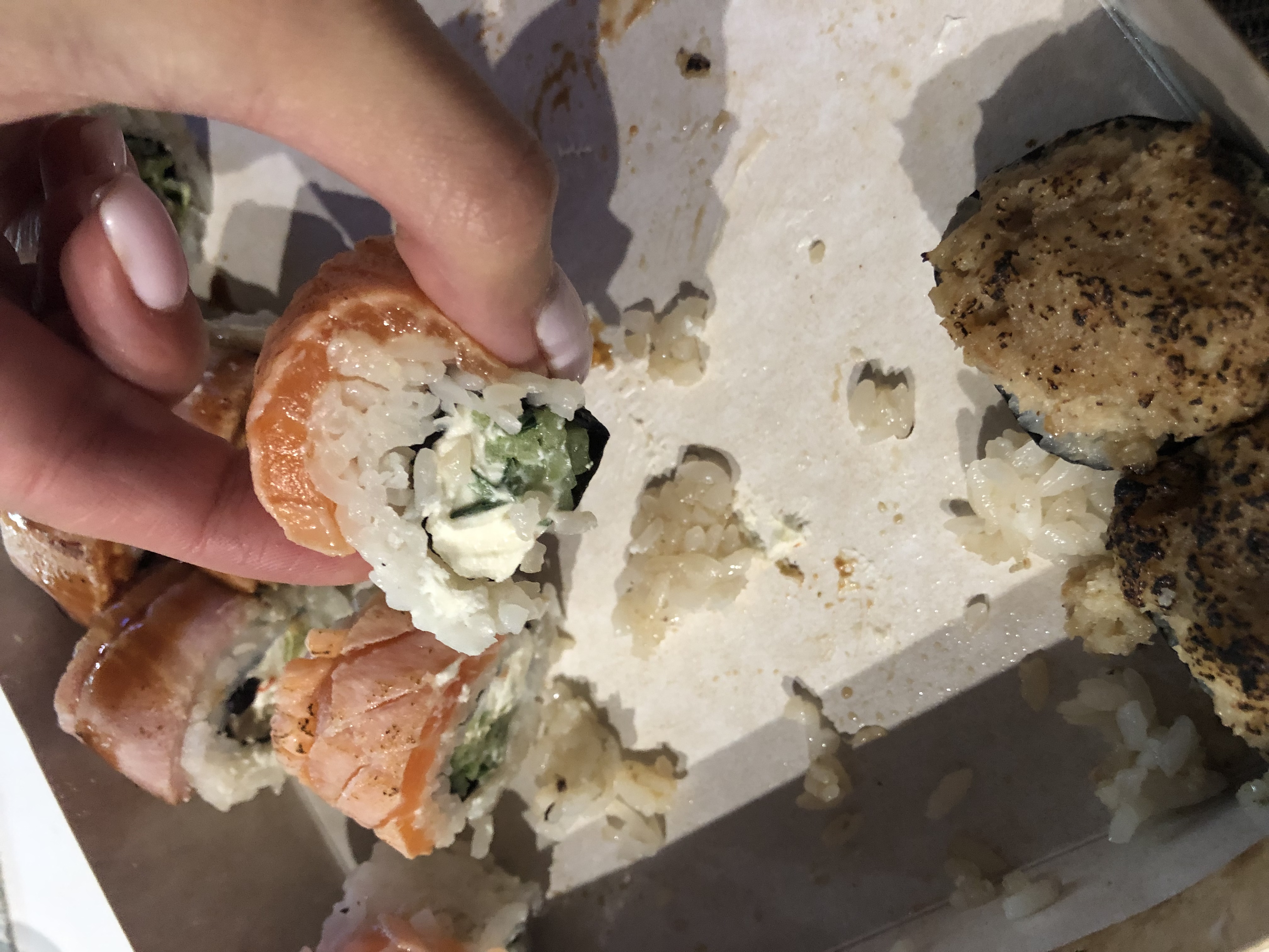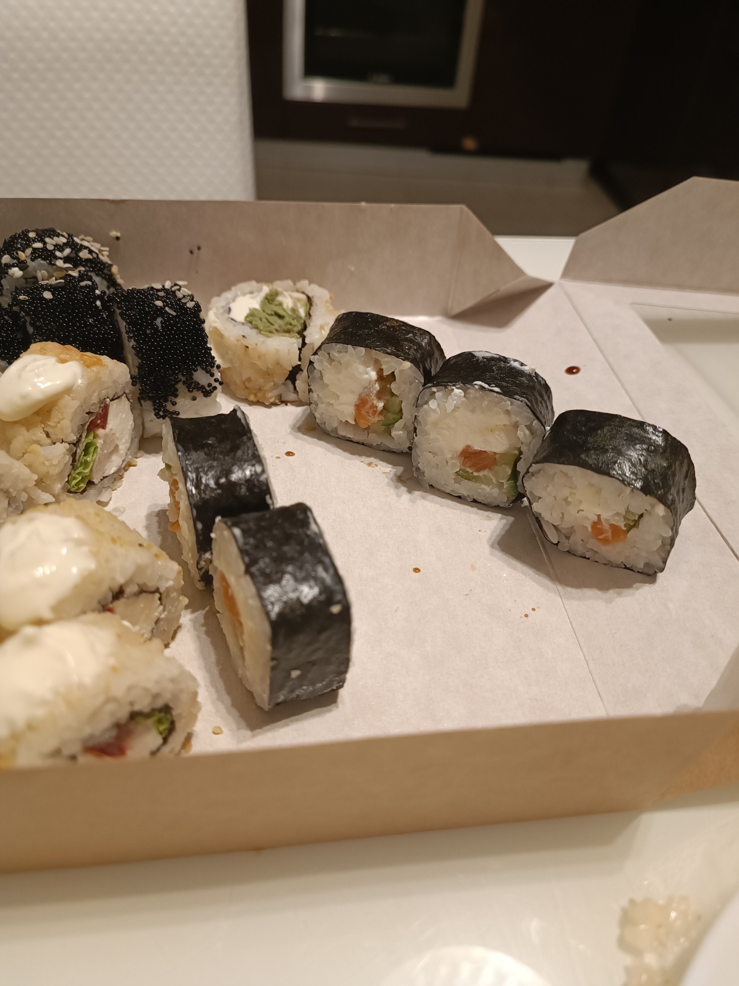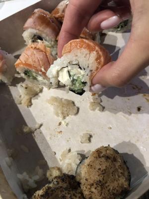 - "Манхеттен": филе лосося, сливочный сыр, авокадо, огурец, кунжут - 8 шт.