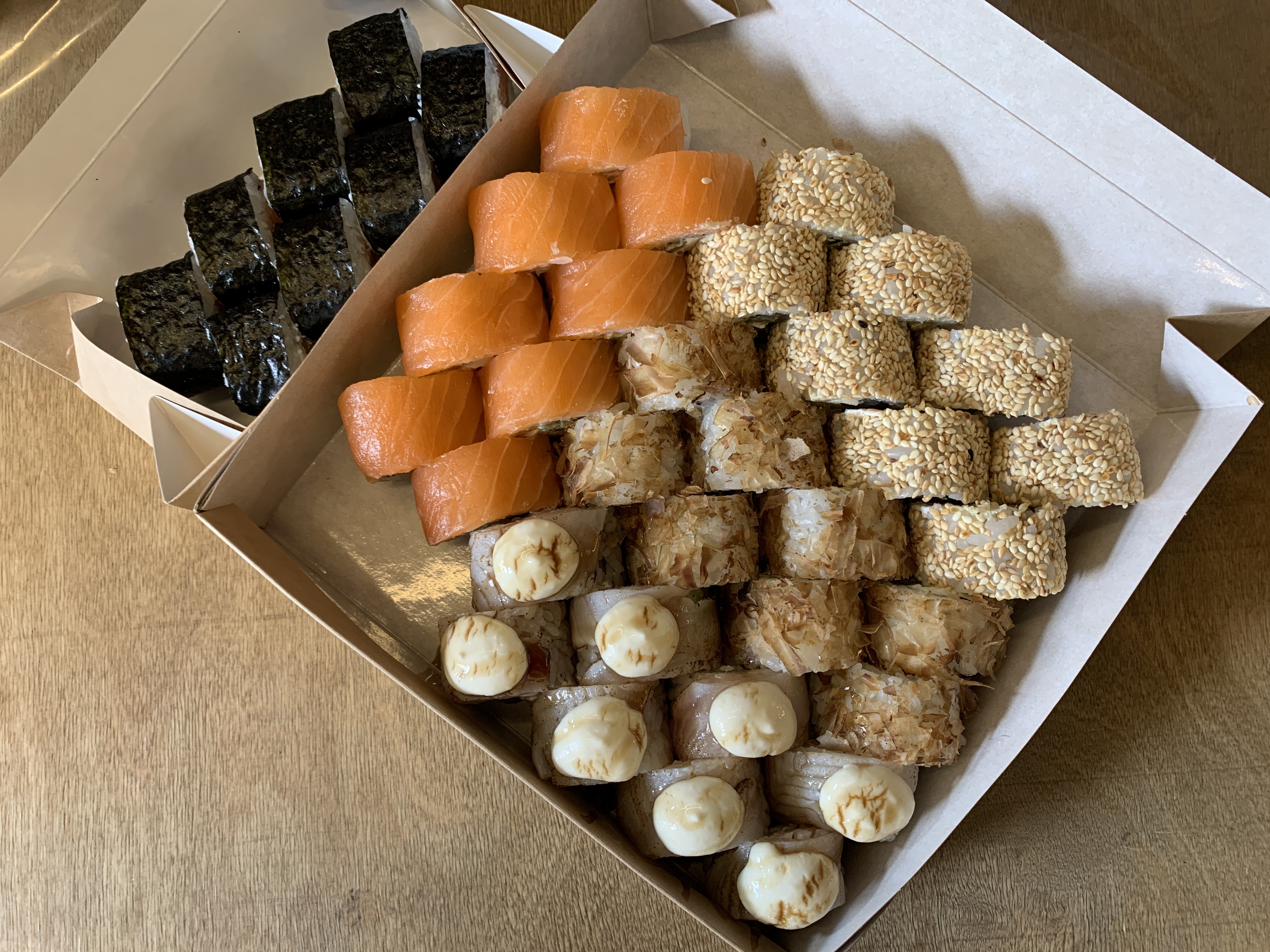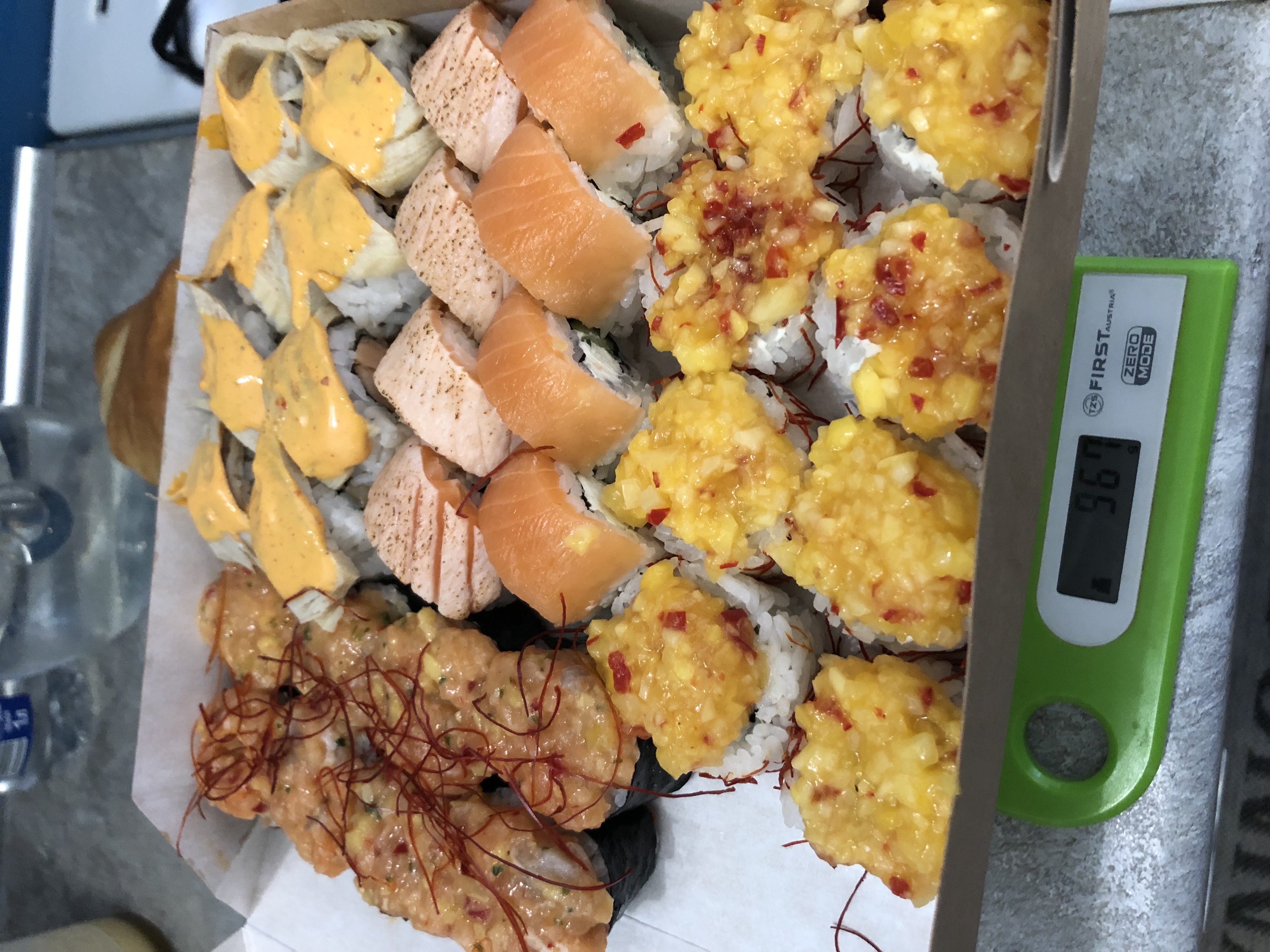 - "Огайо": копченый лосось, острый соус, зеленый лук - 8 шт.