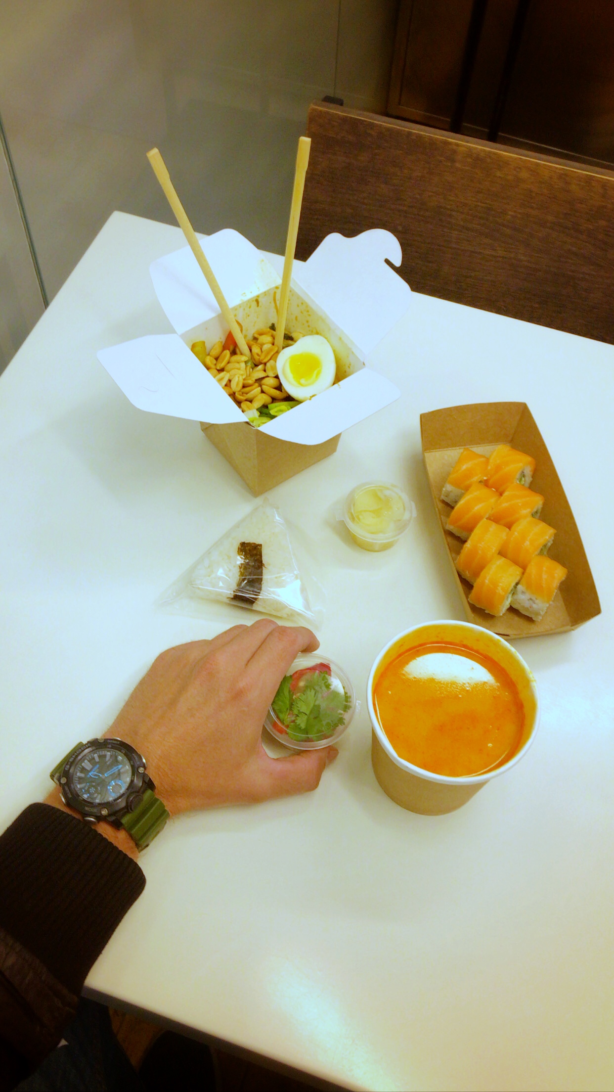 - том кха с цыпленком: бульон, кокосовое молоко, цыпленок, сливки, томаты черри, шампиньоны, лайм, перец чили, кинза, лук перо зеленый, онигири (острое)