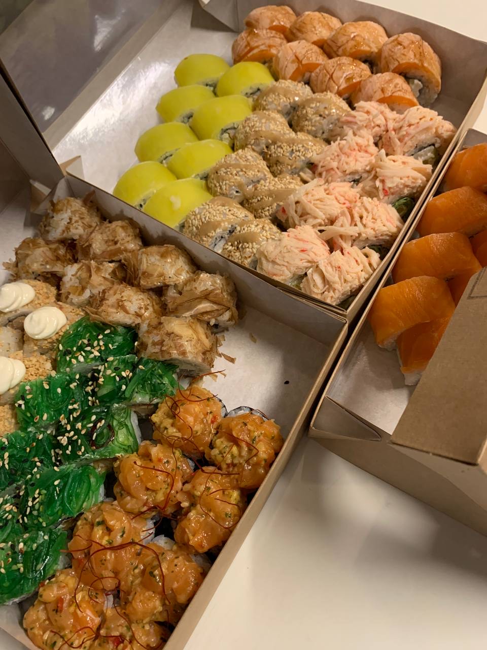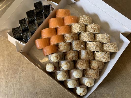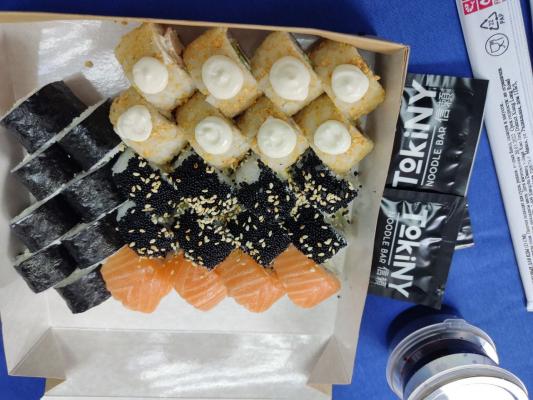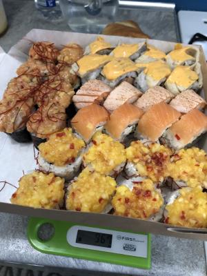 - "Хотсити": жареный морской окунь, сливочный сыр, огурец, омлет тамаго, сырный соус, нори, соус терияки - 8 шт.