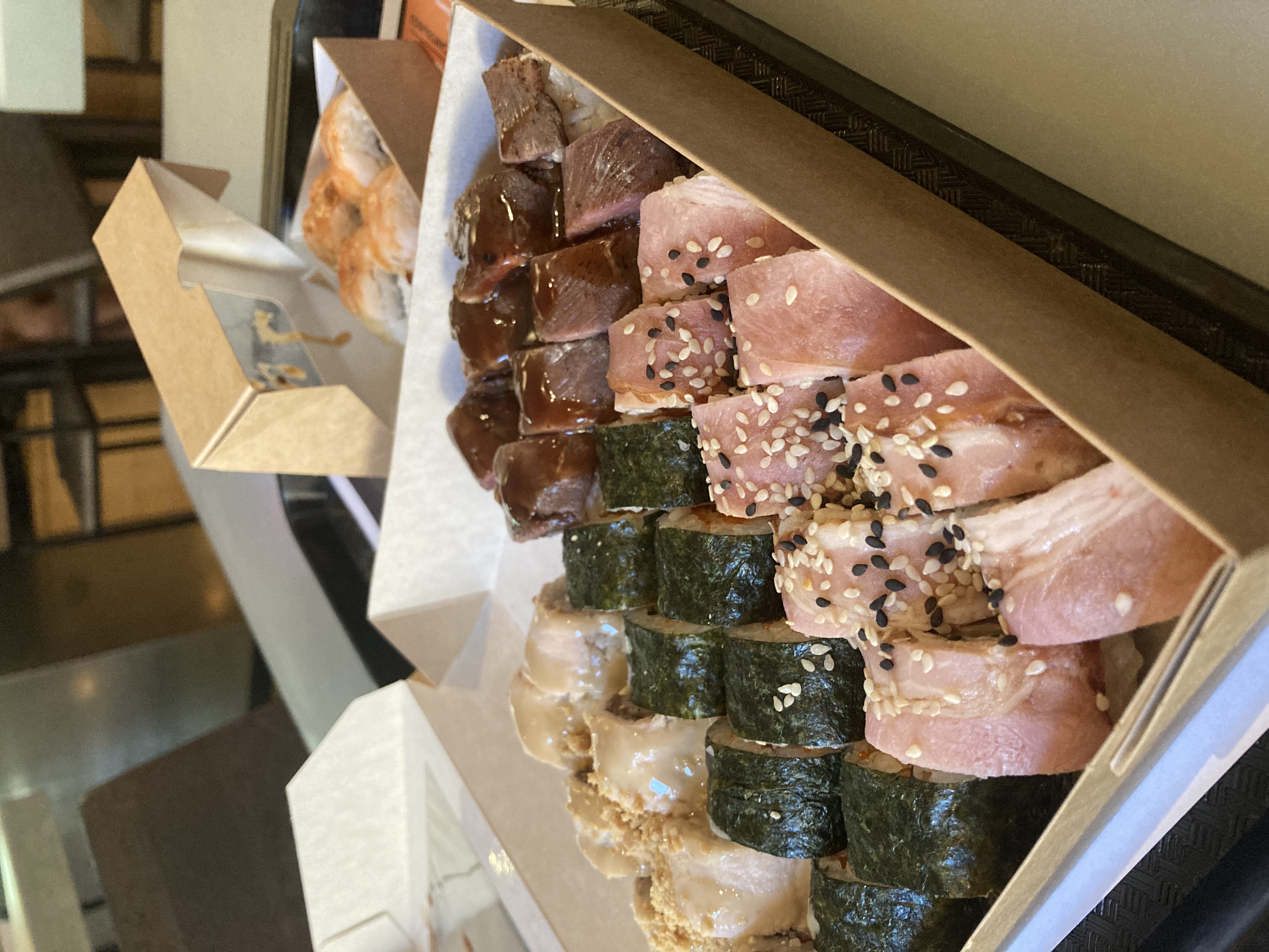 - "Брайтон": филе тунца, сливочный сыр, такуан, огурец, лук зеленый, соус пряный, соус терияки, орехи кешью - 8 шт.