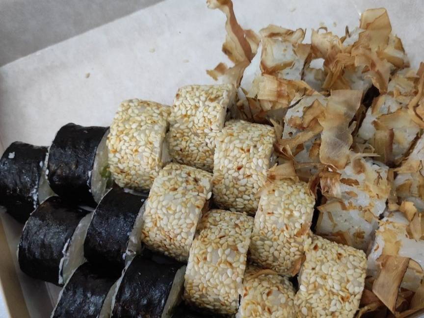 - "Бонито": филе лосося, огурец, сливочный сыр, стружка тунца - 8 шт.