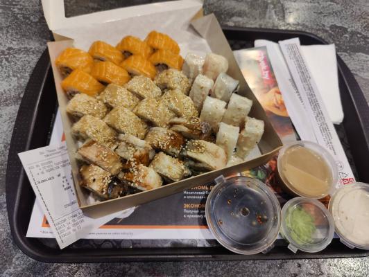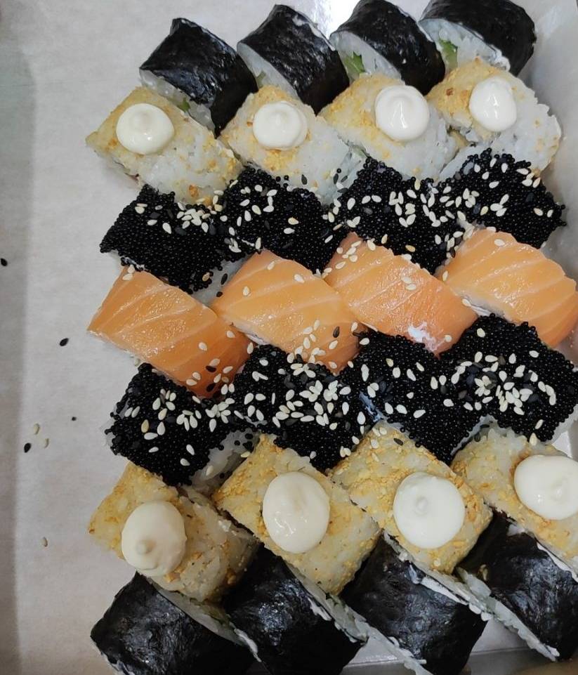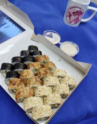 - "Манчестер": жареное филе лосося, такуан, сливочный сыр, омлет тамаго, соус лос-анджелес, кунжут - 8 шт.