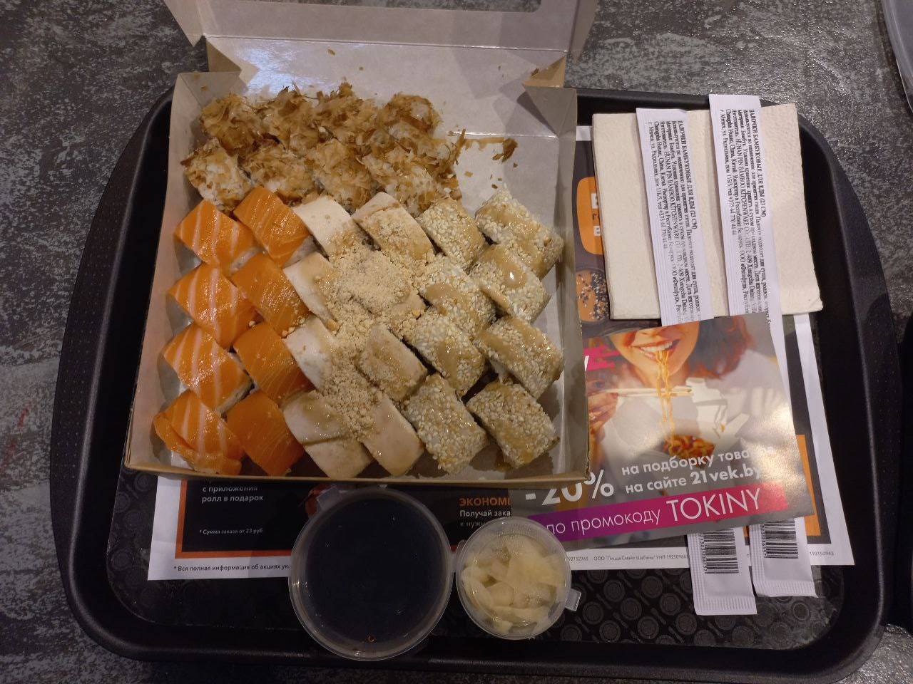 - Промокод дает право на скидку до 30% на доставку и до 40% при заказе на самовывоз (скидка распространяется только на акционные сеты)