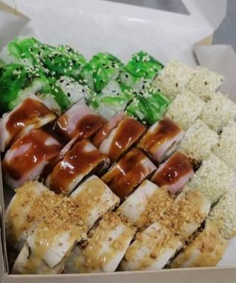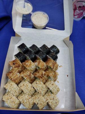 - "Инаги": жареный морской окунь, сливочный сыр, огурец, омлет тамаго, сырный соус, соус терияки, соус пряный - 8 шт.