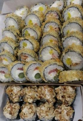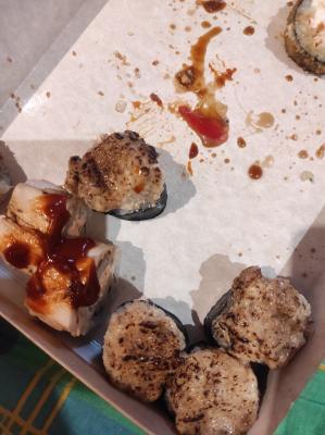 - "Пабло Фрай" (острое): креветка, сливочный сыр, огурец, имбирь маринованный, соус ореховый, панировка - 10 шт.