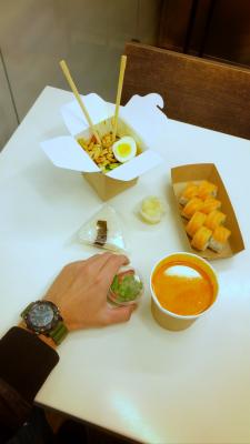 - рамэн с ростбифом (размер "М"): мясной бульон, пшеничная лапша, ростбиф, томаты черри, соевая спаржа, яйцо, древесные грибы, салат ромен, лук перо зеленый