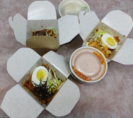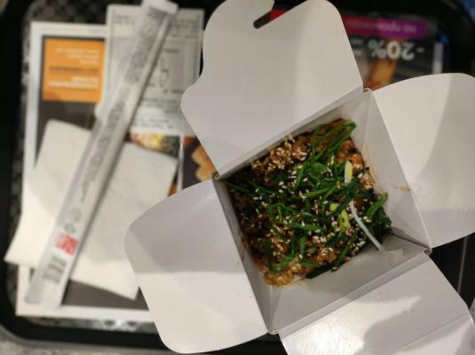 - удон с цыпленком в кисло-сладком соусе (размер М): пшеничная лапша в кисло-сладком соусе, цыпленок-гриль, пекинская капуста, морковь, спаржевая фасоль, ананас, яйцо, лук перо зеленый, нори