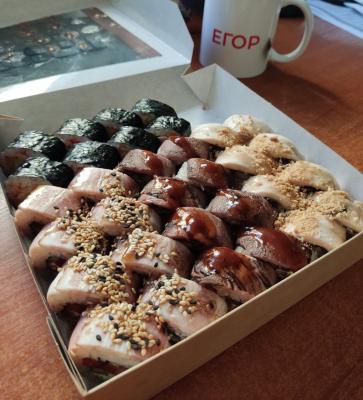 - "Ролл с жаренным окунем и ореховым соусом": жареный окунь, сливочный сыр, огурец, кунжут, соус ореховый - 8 шт.