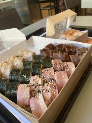 - "Магуро грин": филе тунца, сливочный сыр, салат Айсберг, салат чука, сурими, соус ореховый классик - 8 шт