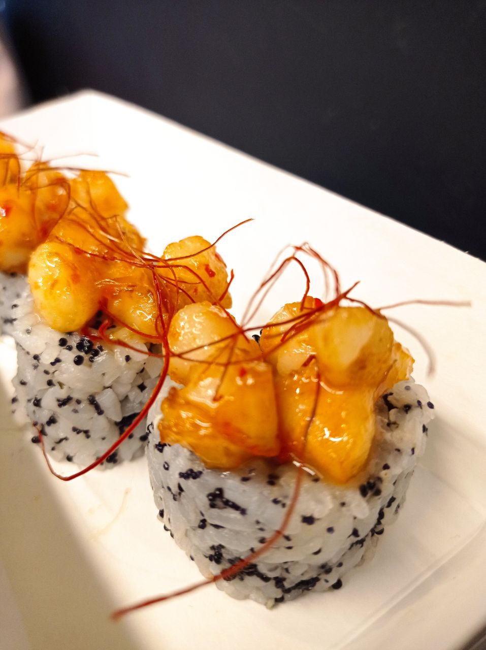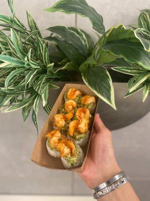 - "Висконсин🌶": креветка, сыр чеддер, пряный соус, соус сладко-ореховый, криспи - 8 шт.
