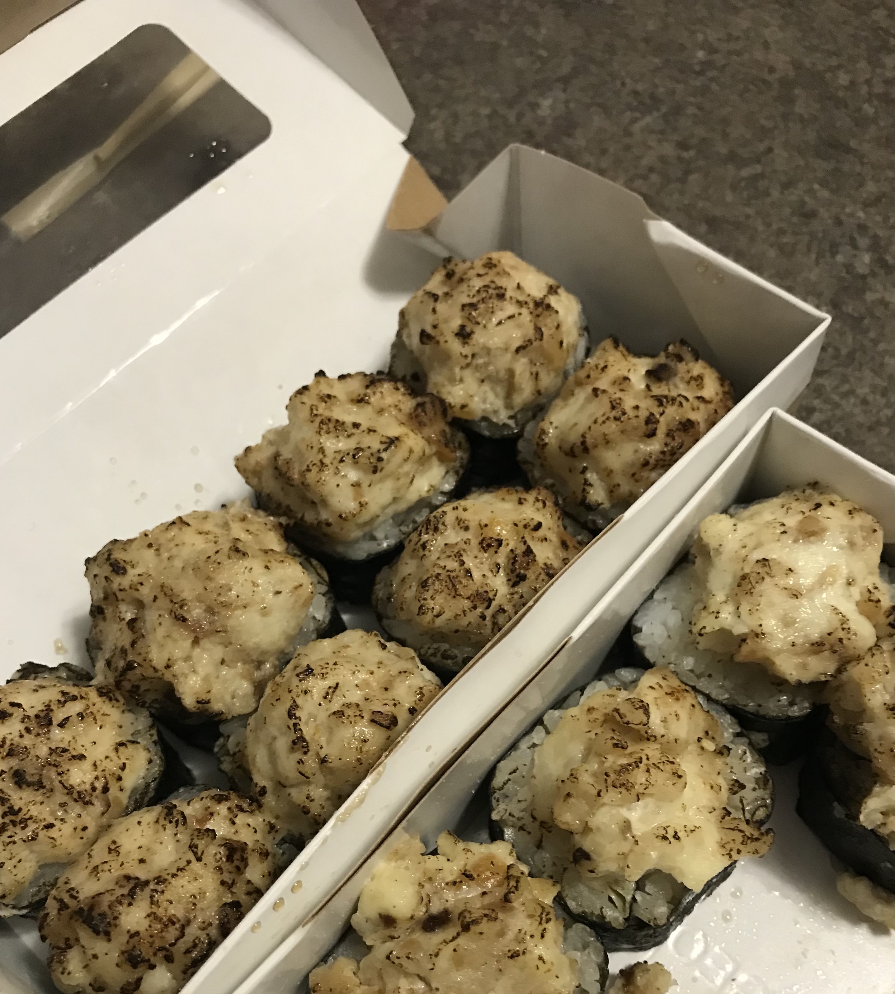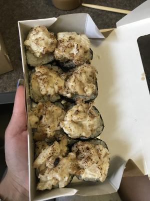 - "Пабло Фрай" (острое): креветка, сливочный сыр, огурец, имбирь маринованный, соус ореховый, панировка - 10 шт.