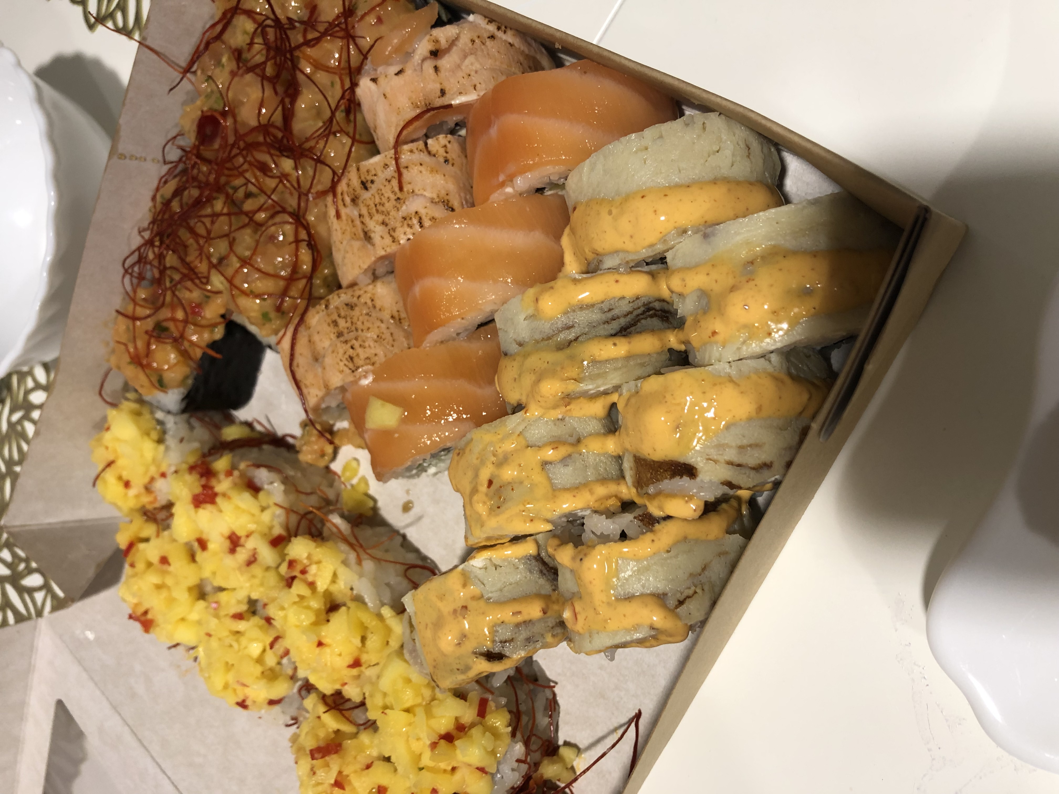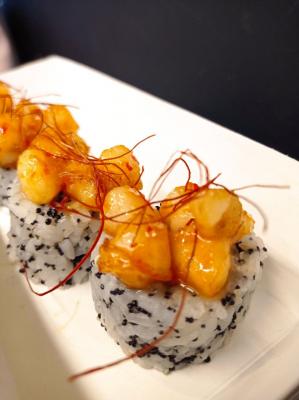 - "Бостон": креветка, сливочный сыр, ананас, салат Айсберг, соус сладко-ореховый, икра Тобико красная. Острое - 8 шт.