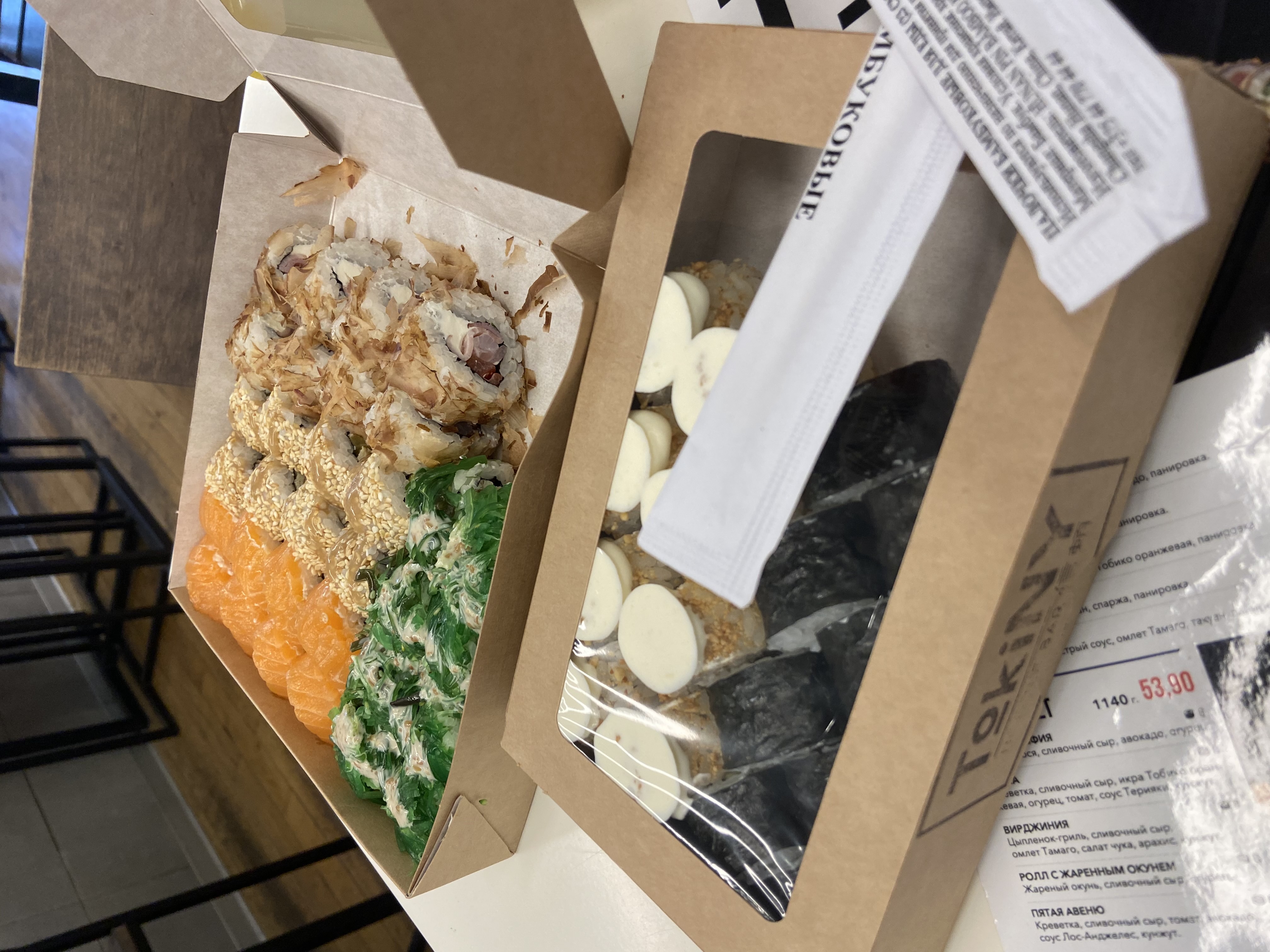 - "Калифорния лайт": сливочный сыр, сурими, салат айсберг, икра тобико красная, кунжут - 8 шт.