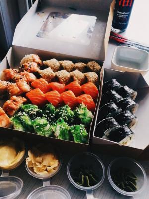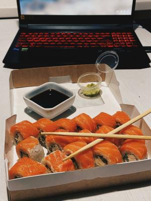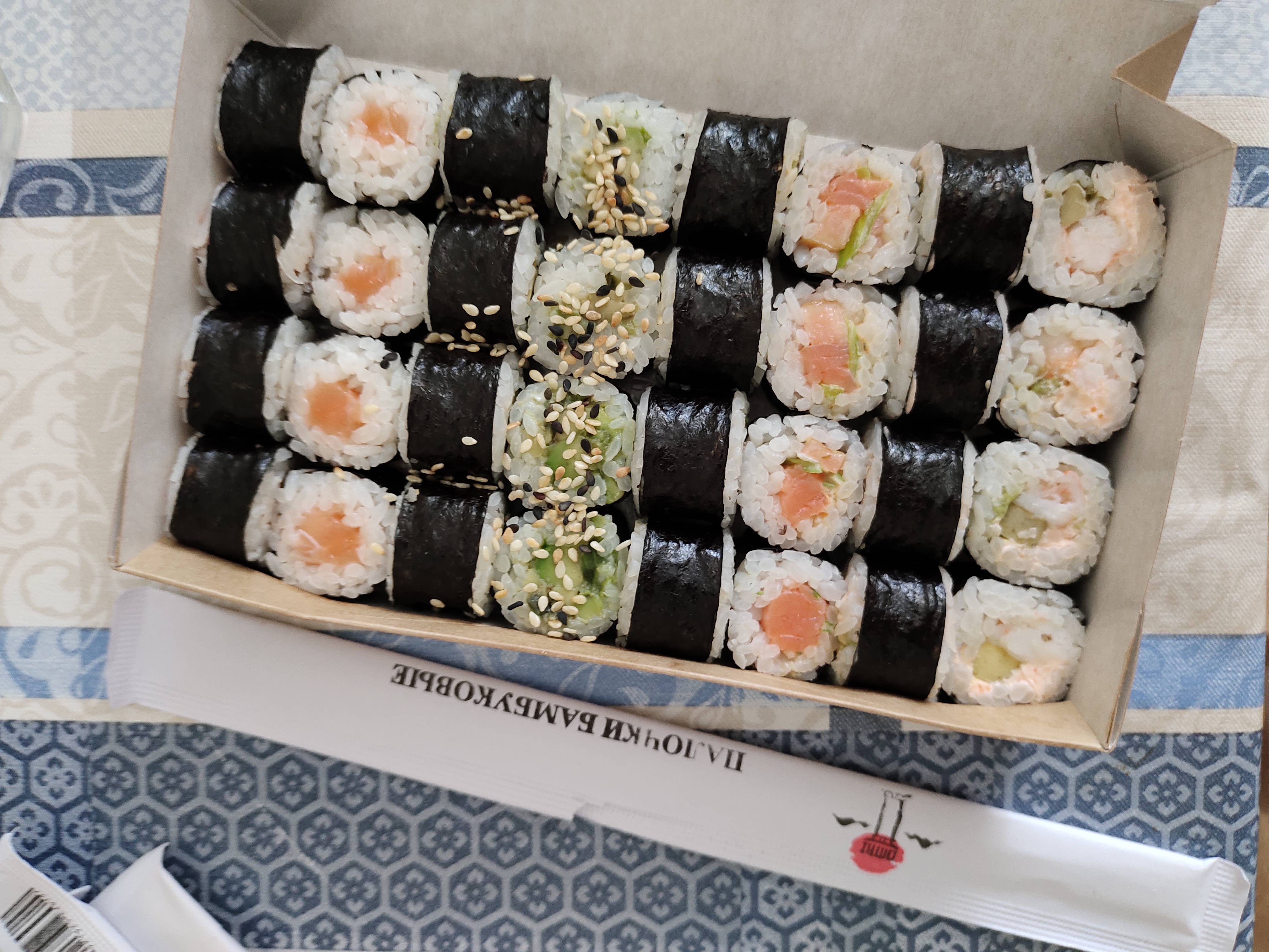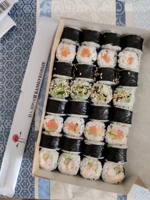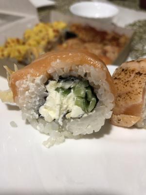 - "Манхеттен": филе лосося, сливочный сыр, авокадо, огурец, кунжут - 8 шт.