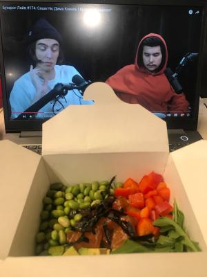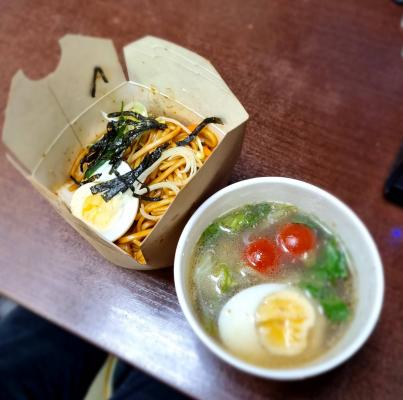 - рамэн с ростбифом (размер "М"): мясной бульон, пшеничная лапша, ростбиф, томаты черри, соевая спаржа, яйцо, древесные грибы, салат ромен, лук перо зеленый