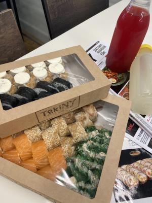 - "Брайтон": филе тунца, сливочный сыр, такуан, огурец, лук зеленый, соус пряный, соус терияки, орехи кешью - 8 шт.