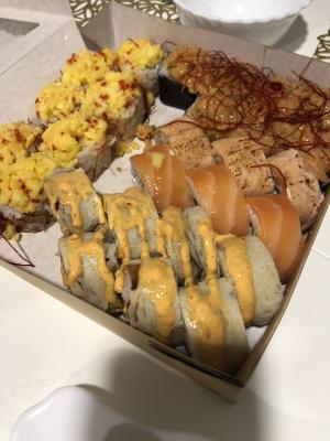 - "Хотсити": жареный морской окунь, сливочный сыр, огурец, омлет тамаго, сырный соус, нори, соус терияки - 8 шт.
