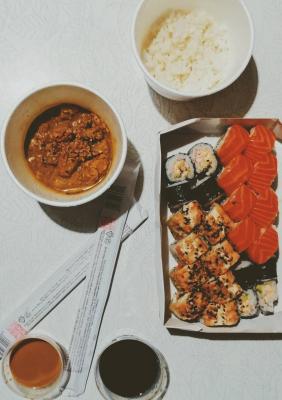 - тяхан со свининой чашу в соусе терияки (размер "М"): японский рис, обжаренный в кунжутном масле с яйцом, соус терияки, свинина чашу, морковь, кунжут, репчатый рук, лук перо зеленый- удон с цыпленком в кисло-сладком соусе (размер "М"): пшеничная лапша в кисло-сладком соусе, цыпленок, пекинская капуста, морковь, спаржевая фасоль, ананас, яйцо, лук перо зеленый, нори