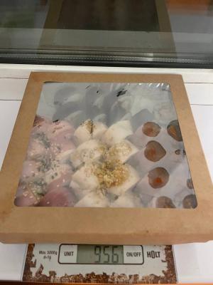 Минусы : недовес, заявленной было 1000 г, на фото как было на самом деле, не скажу что прям много ингредиентов по закладке, но это не так расстроило как недовес, необрезанные края роллов, которые не красиво выглядят