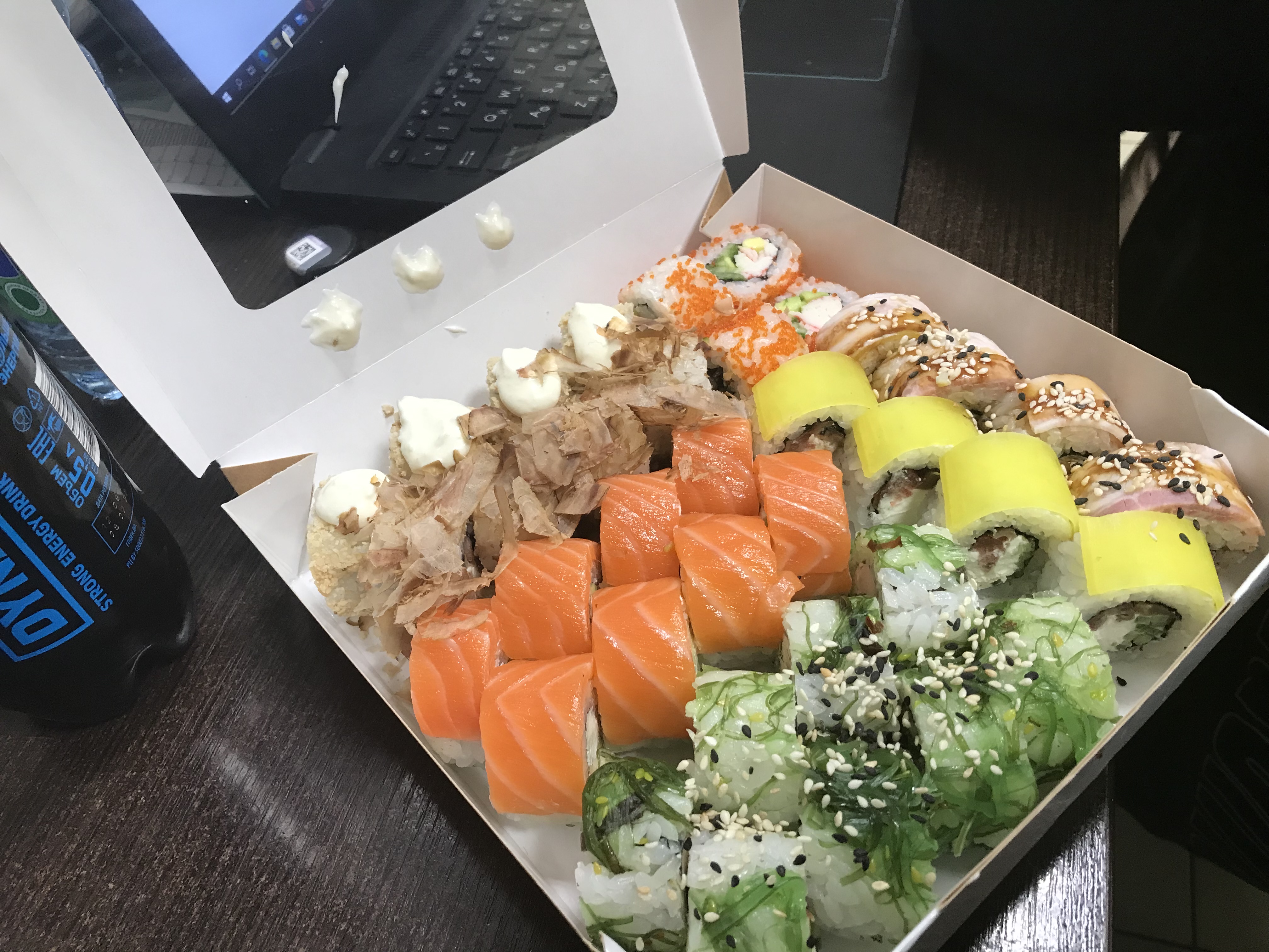 - ролл "Колорадо": жареный лосось в соусе терияки, сыр чеддер, соус сырный, криспи - 8 шт.