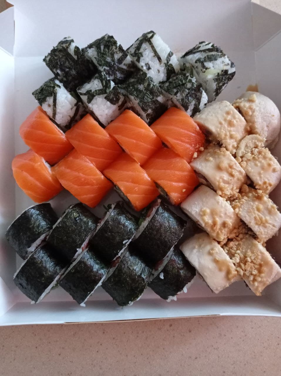 - "Манхеттен": филе лосося, сливочный сыр, авокадо, огурец, кунжут - 8 шт.