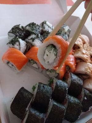 - "Огайо": копченый лосось, острый соус, зеленый лук - 8 шт.