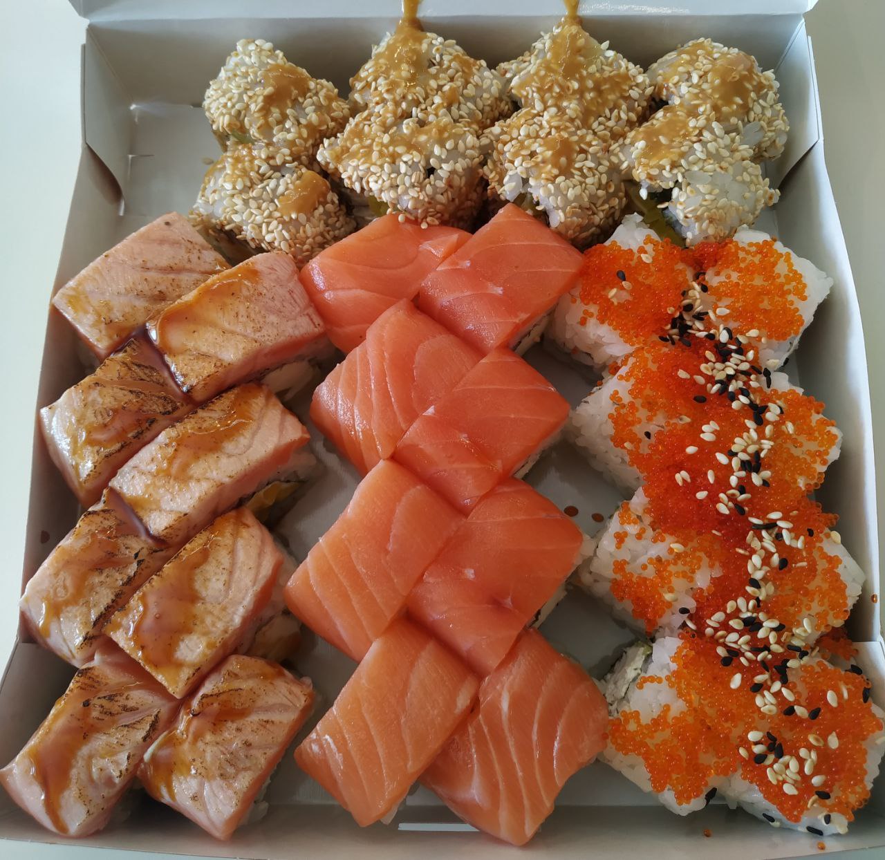 - "Манчестер": жареное филе лосося, такуан, сливочный сыр, омлет тамаго, соус лос-анджелес, кунжут - 8 шт.