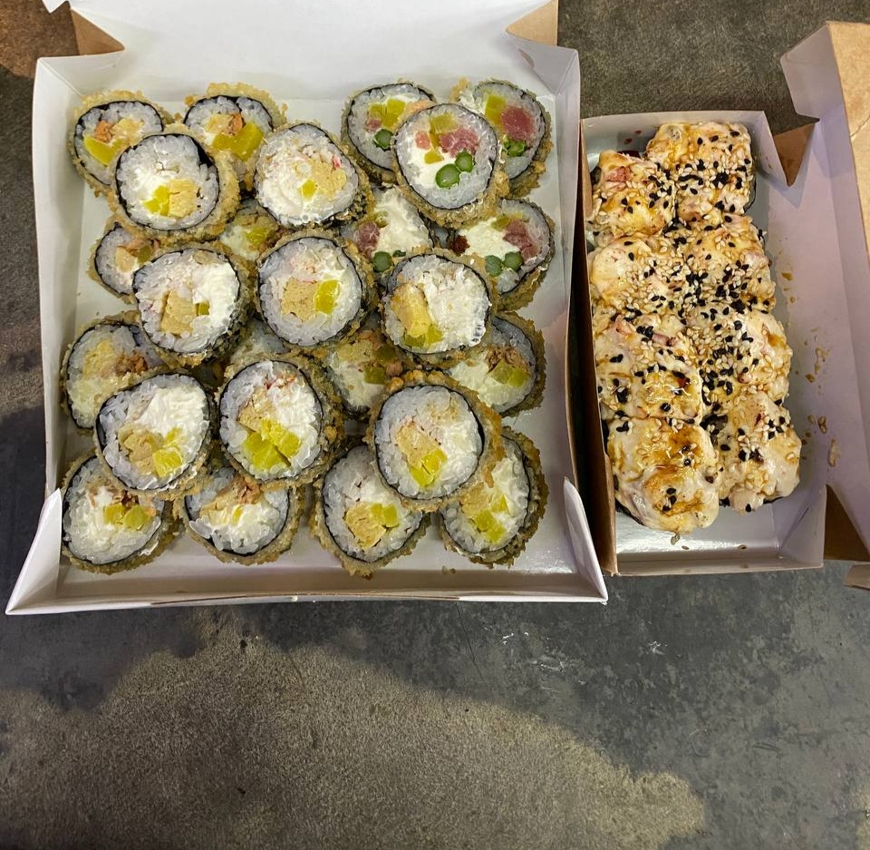 - "Пабло Фрай" (острое): креветка, сливочный сыр, огурец, имбирь маринованный, соус ореховый, панировка - 10 шт.