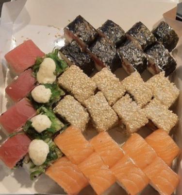 - "Манхеттен": филе лосося, сливочный сыр, авокадо, огурец, кунжут - 8 шт.