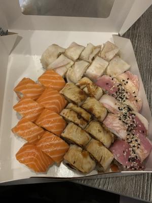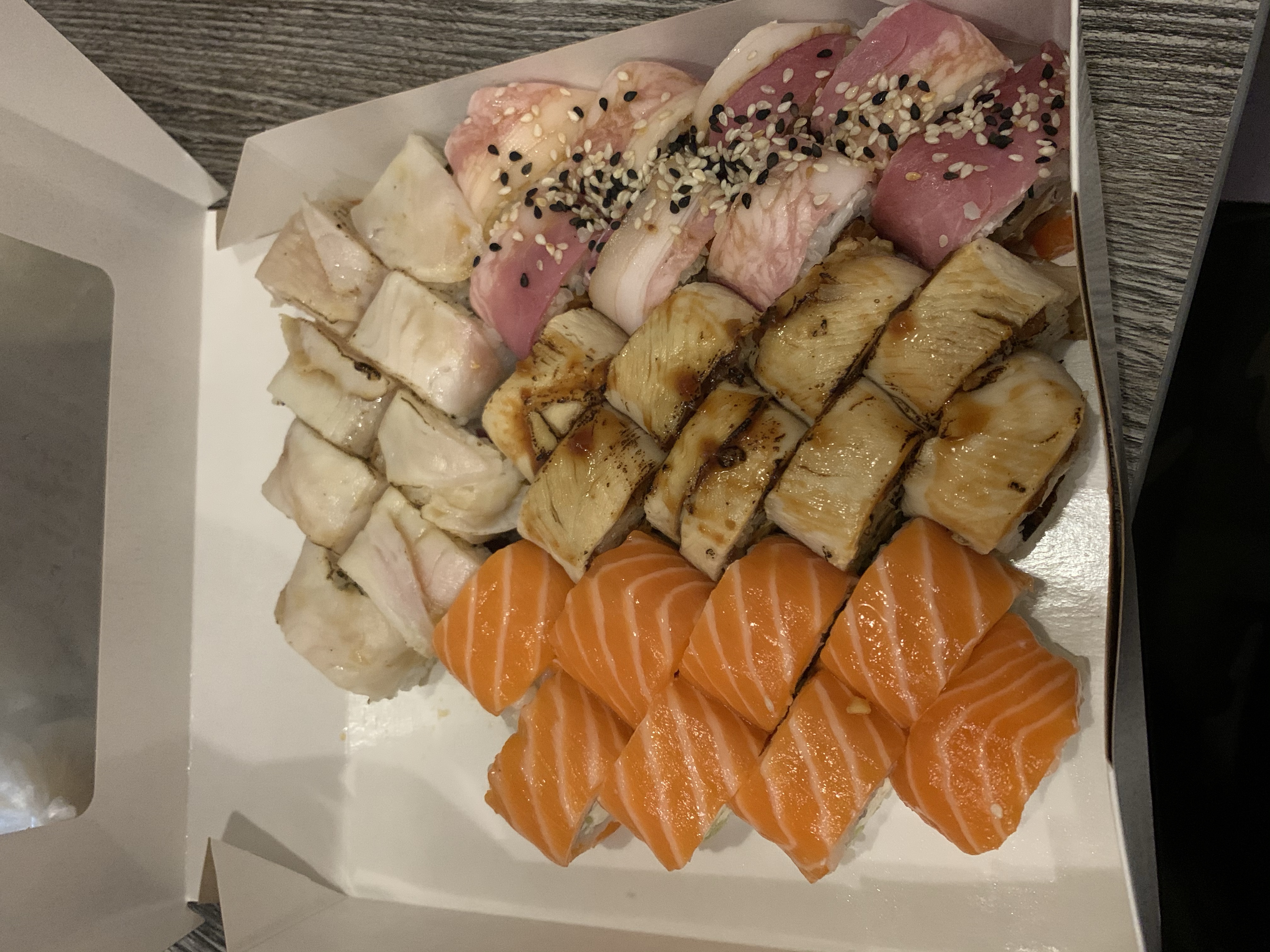- "Манчестер": жареное филе лосося, такуан, сливочный сыр, омлет тамаго, соус лос-анджелес, кунжут - 8 шт.