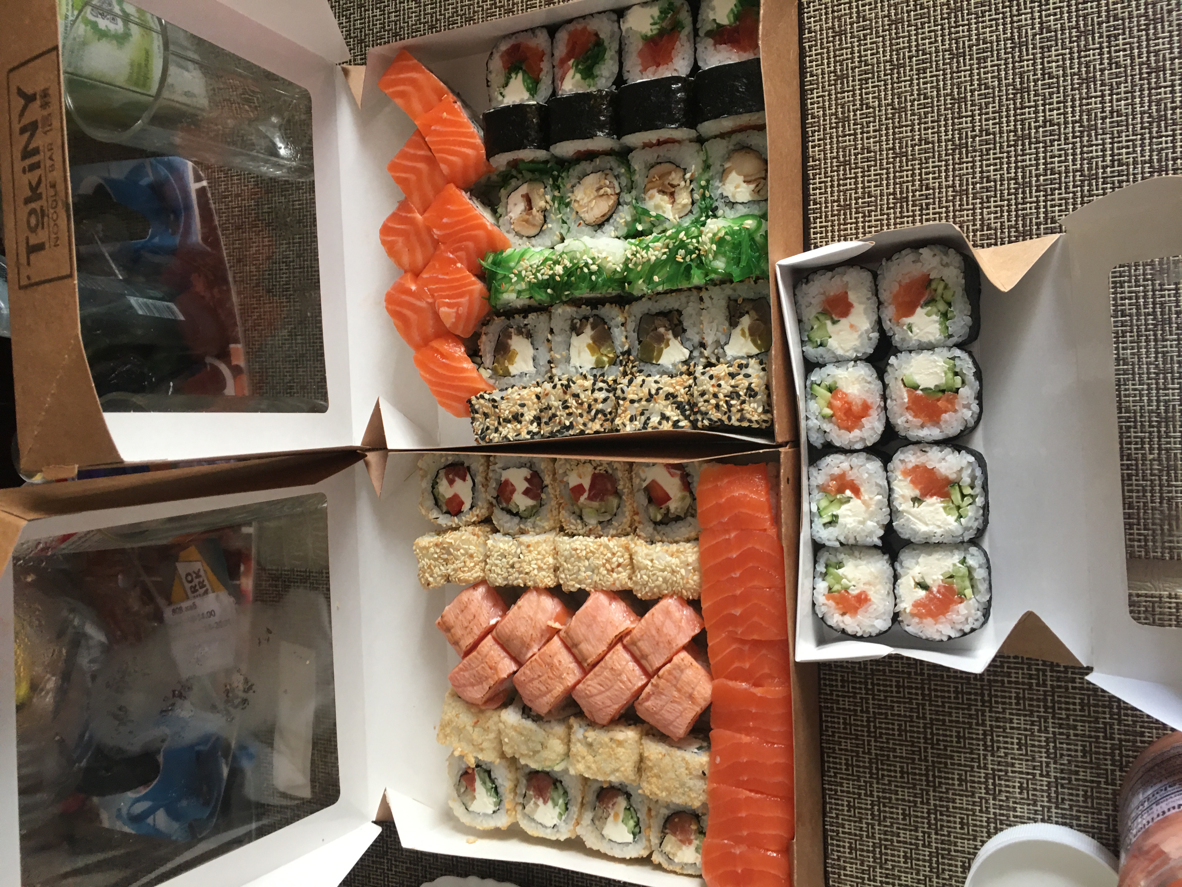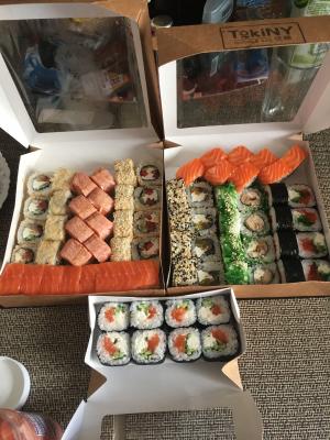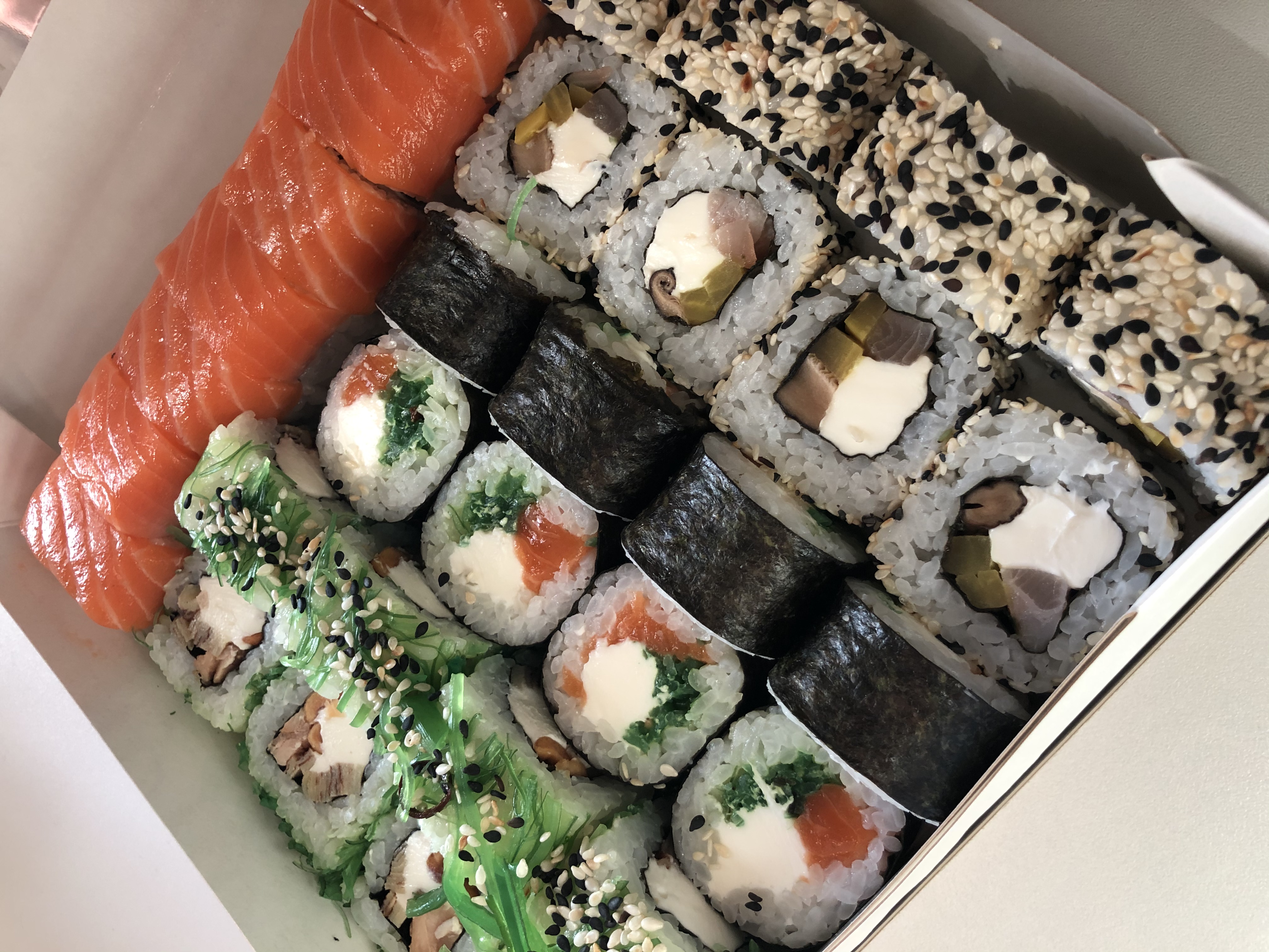 - "Манхеттен": филе лосося, сливочный сыр, авокадо, огурец, кунжут - 8 шт.