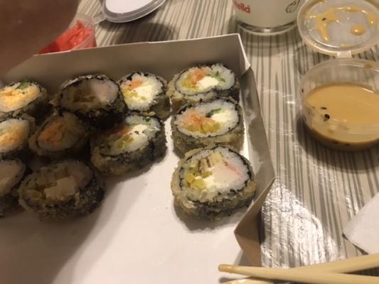 - "Пабло Фрай" (острое): креветка, сливочный сыр, огурец, имбирь маринованный, соус ореховый, панировка - 10 шт.