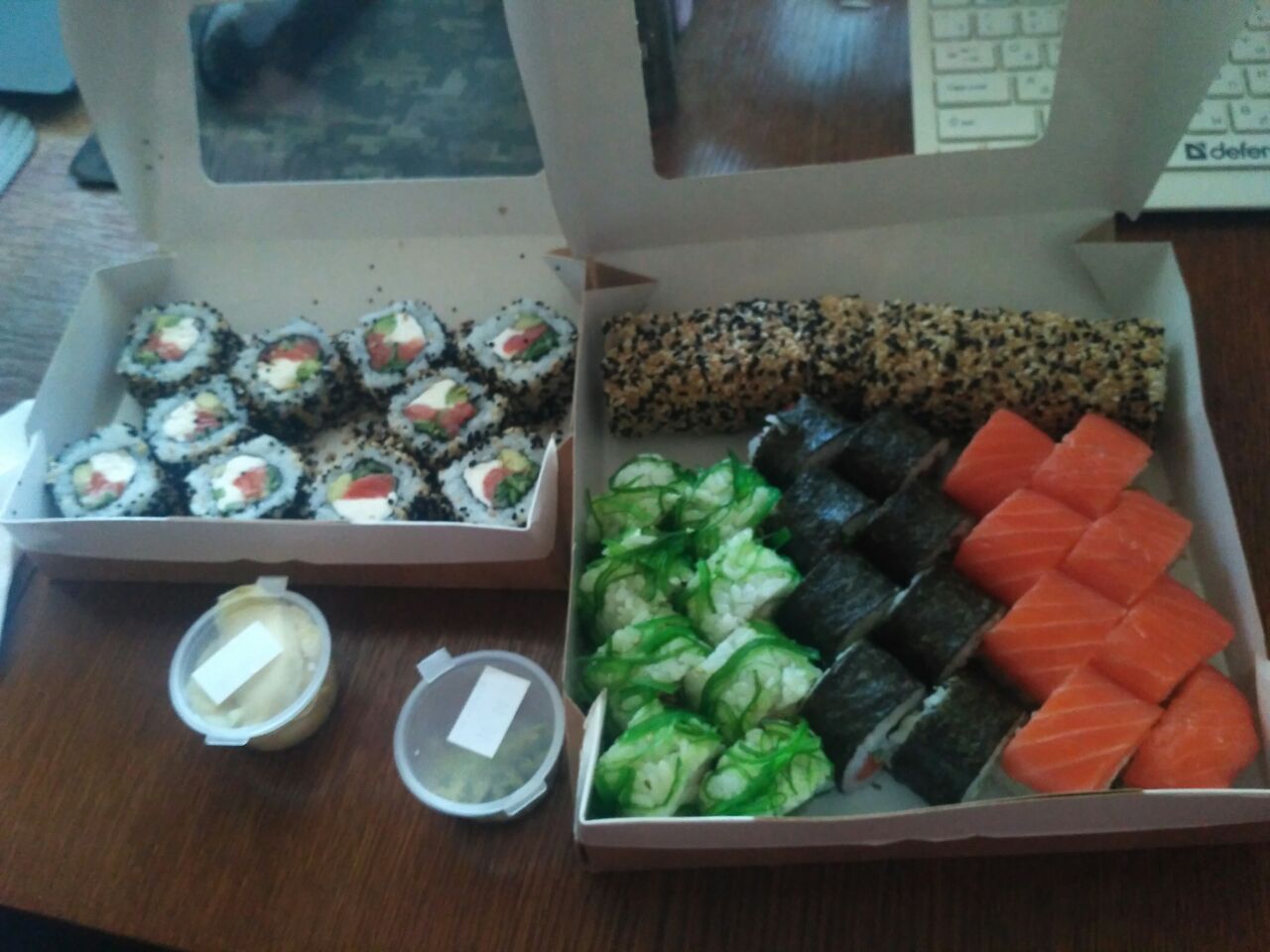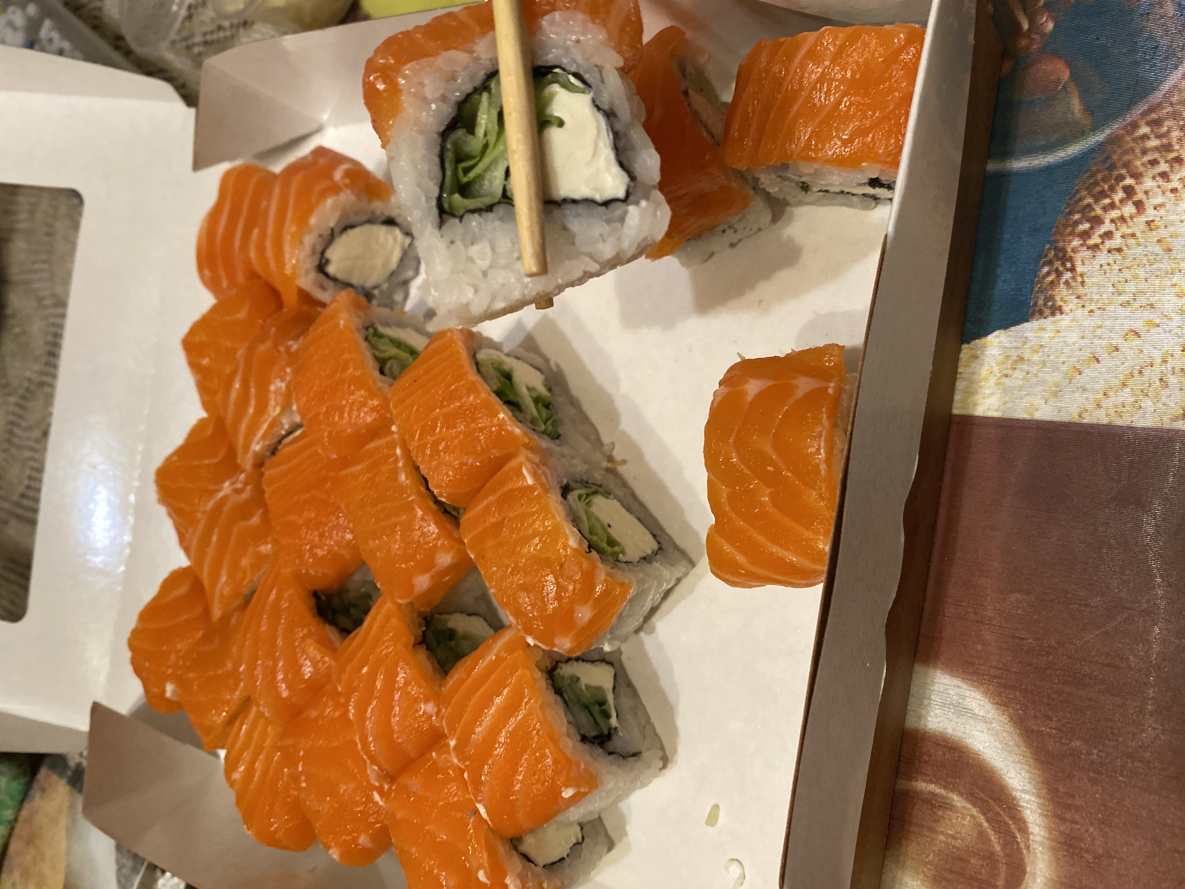 Обычные роллы, похожие на магазинные. Очень удивлена, что в филадельфию положили капусту 🙄Больше здесь заказывать не буду