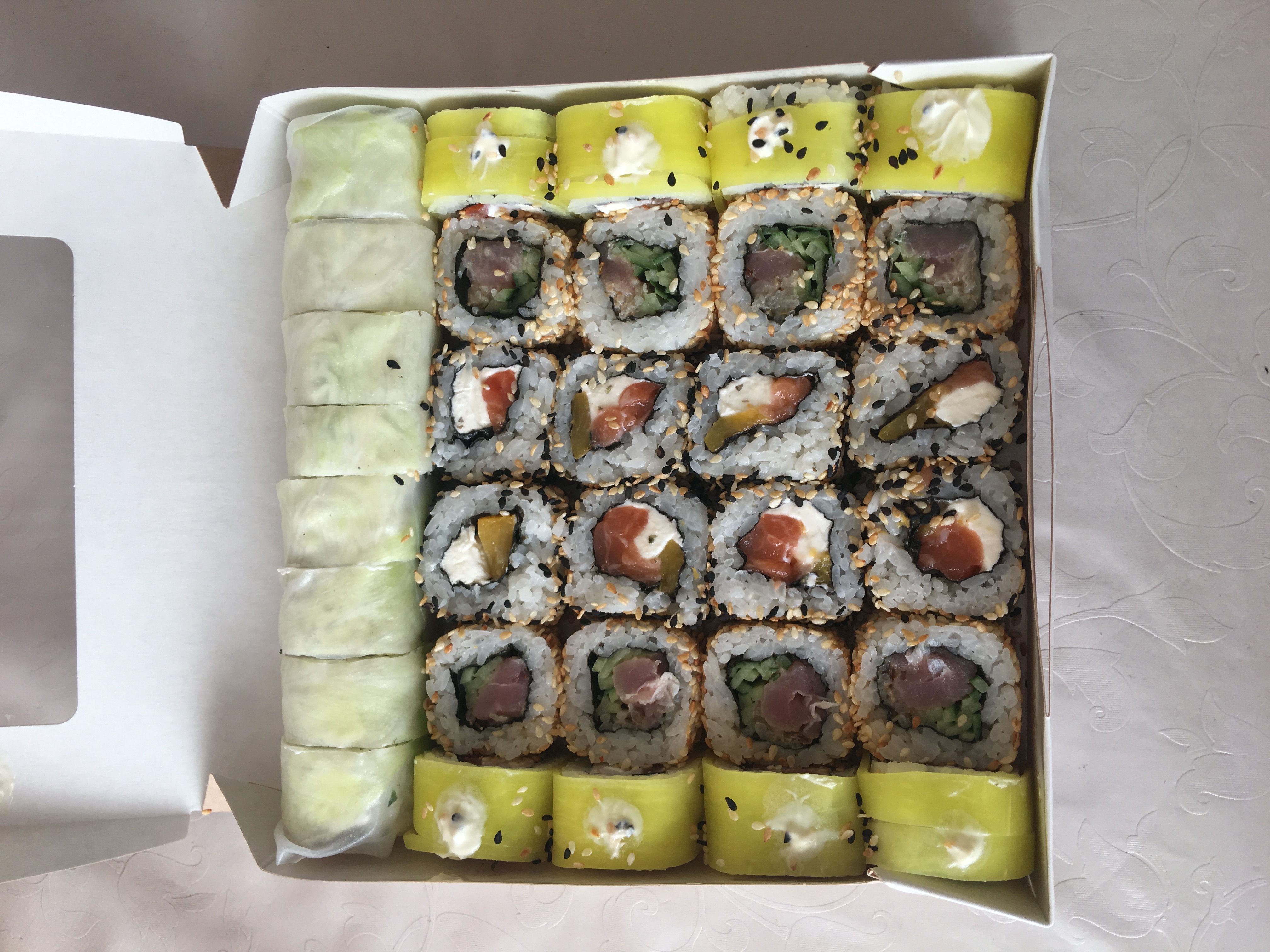 - "Чарлстон": филе лосося, сливочный сыр, филе тунца, лук жареный, огурец - 8 шт.