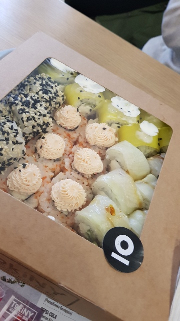 - "Ролл с лососем и манго в кунжуте": филе лосося, сливочный сыр, салат айсберг, манго, кунжут, кешью - 8 шт.