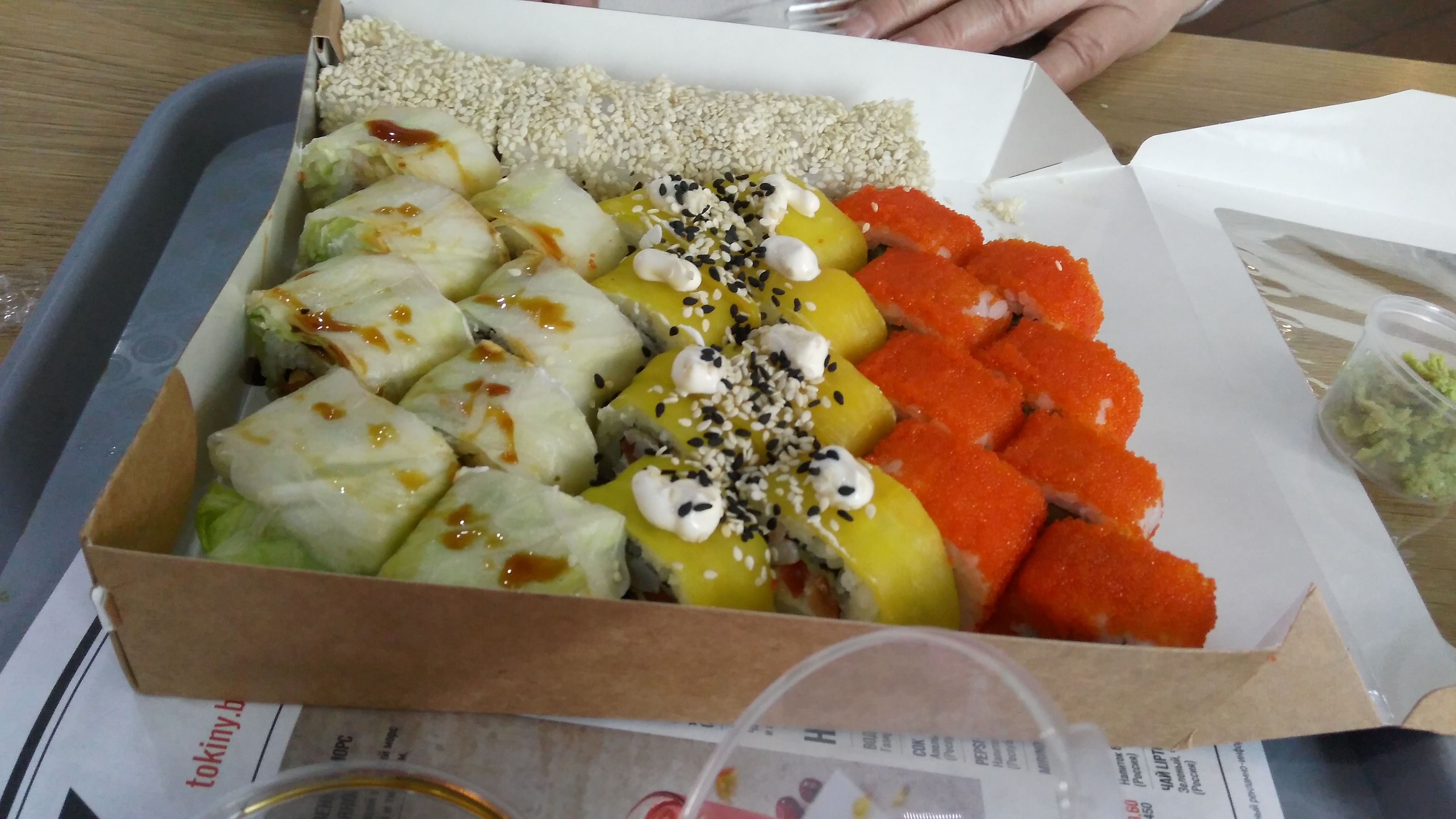 - "Хотсити": жареный морской окунь, сливочный сыр, огурец, омлет тамаго, сырный соус, нори, соус терияки - 8 шт.