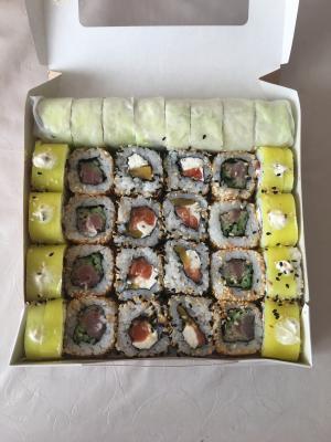 - "Магуро грин": филе тунца, сливочный сыр, салат Айсберг, салат чука, сурими, соус ореховый классик - 8 шт
