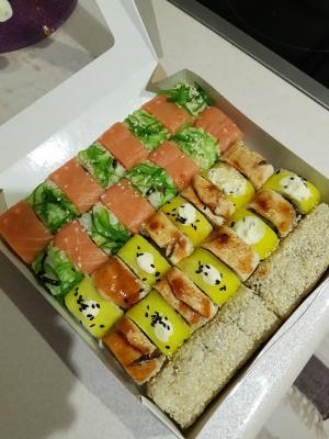 - "Манхеттен": филе лосося, сливочный сыр, авокадо, огурец, кунжут - 8 шт.