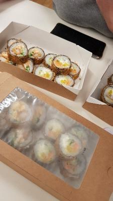 - "Бостон": креветка, сливочный сыр, ананас, салат Айсберг, соус сладко-ореховый, икра Тобико красная. Острое - 8 шт.