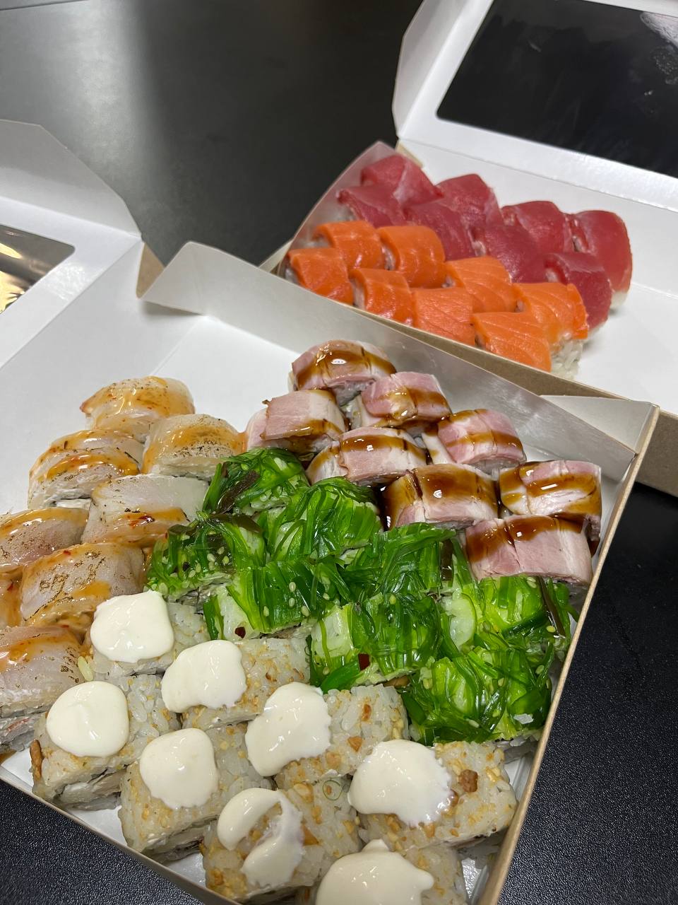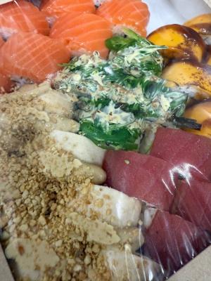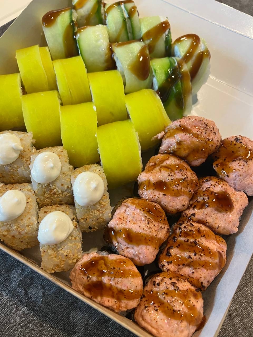 - "Магуро грин": филе тунца, сливочный сыр, салат Айсберг, салат чука, сурими, соус ореховый классик - 8 шт