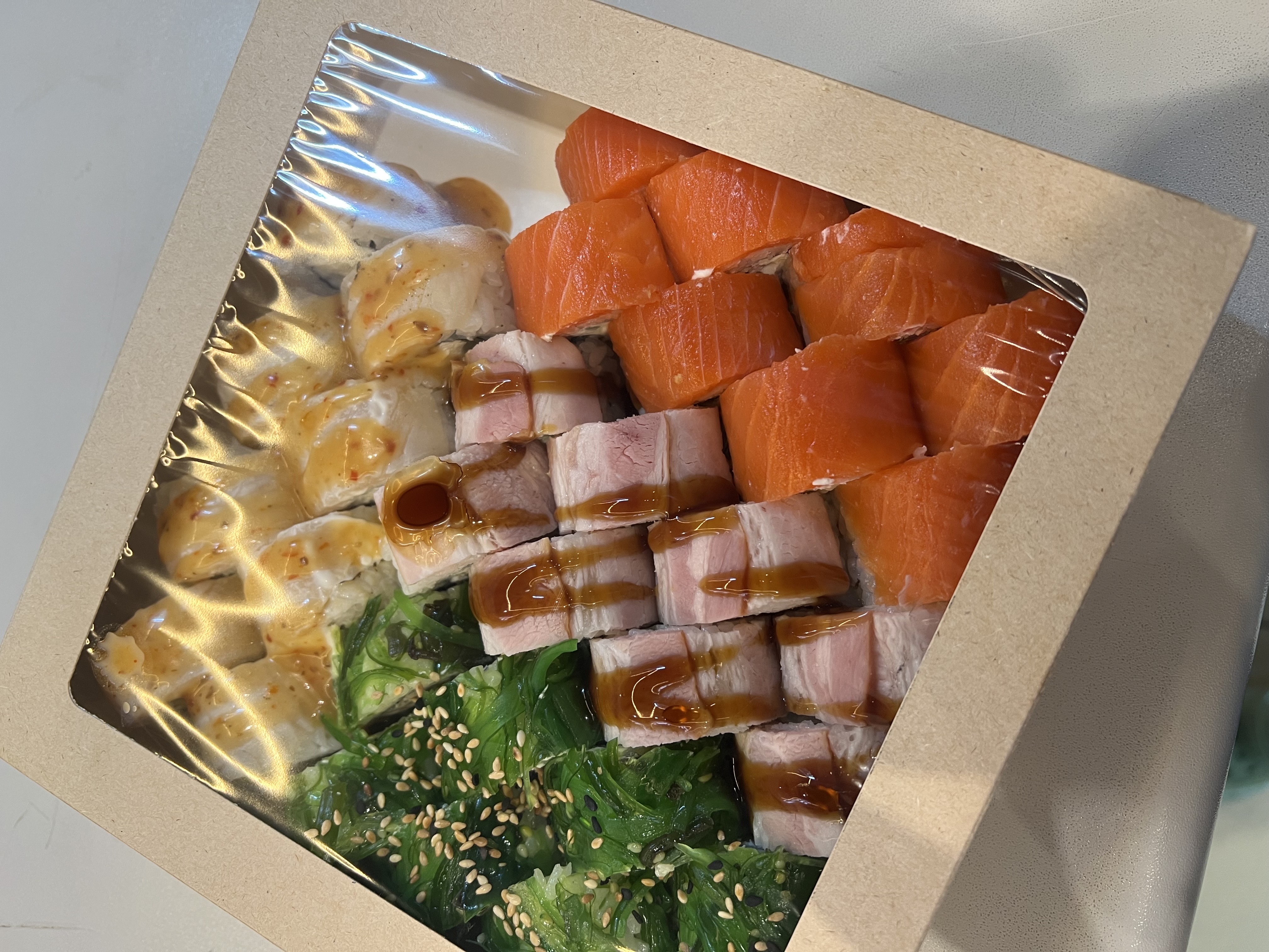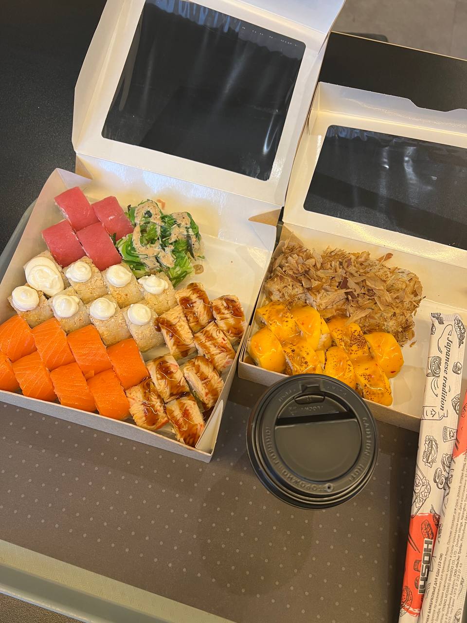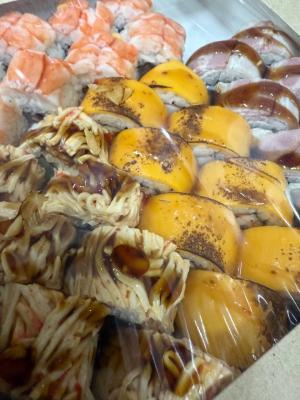 - "Манчестер": жареное филе лосося, такуан, сливочный сыр, омлет тамаго, соус лос-анджелес, кунжут - 8 шт.