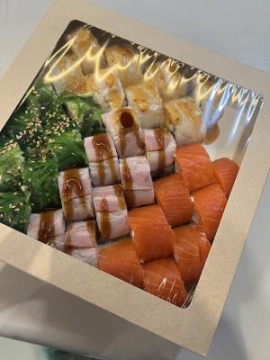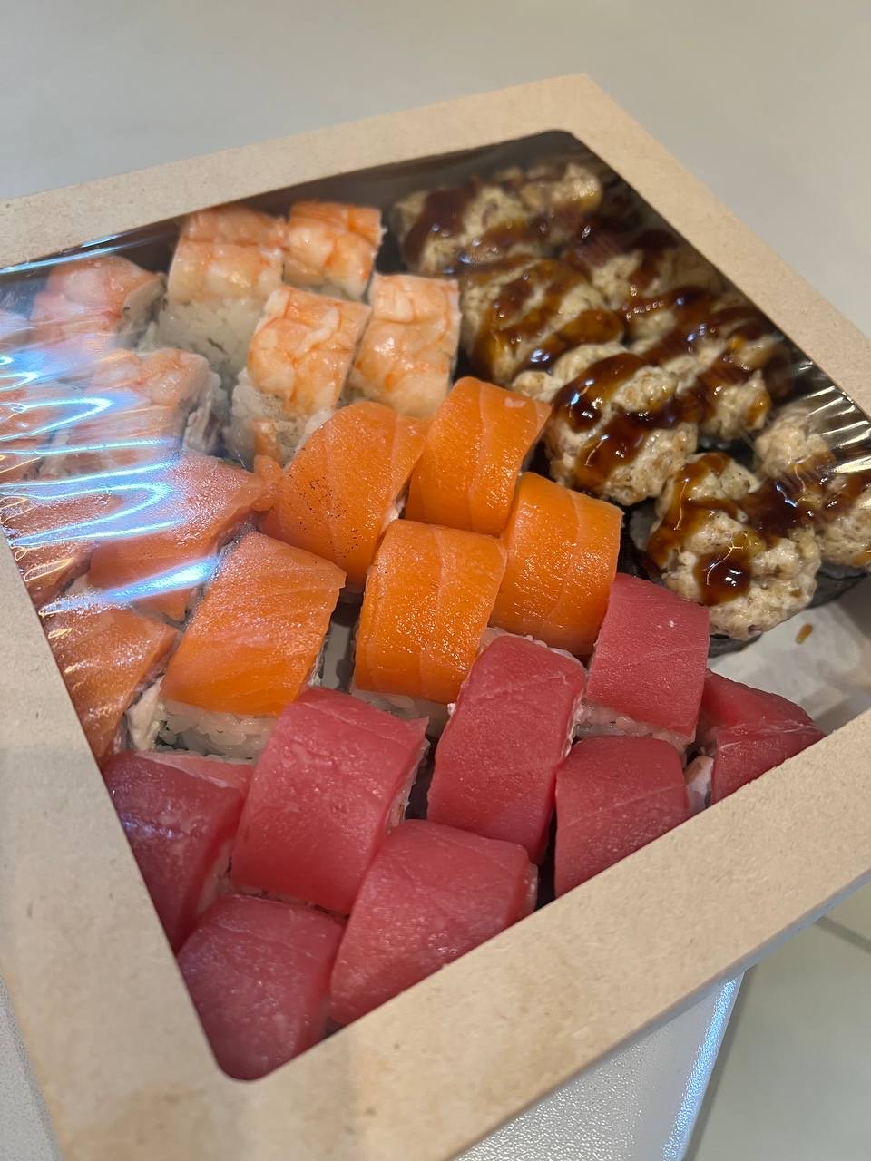 - "Бостон": креветка, сливочный сыр, ананас, салат Айсберг, соус сладко-ореховый, икра Тобико красная. Острое - 8 шт.