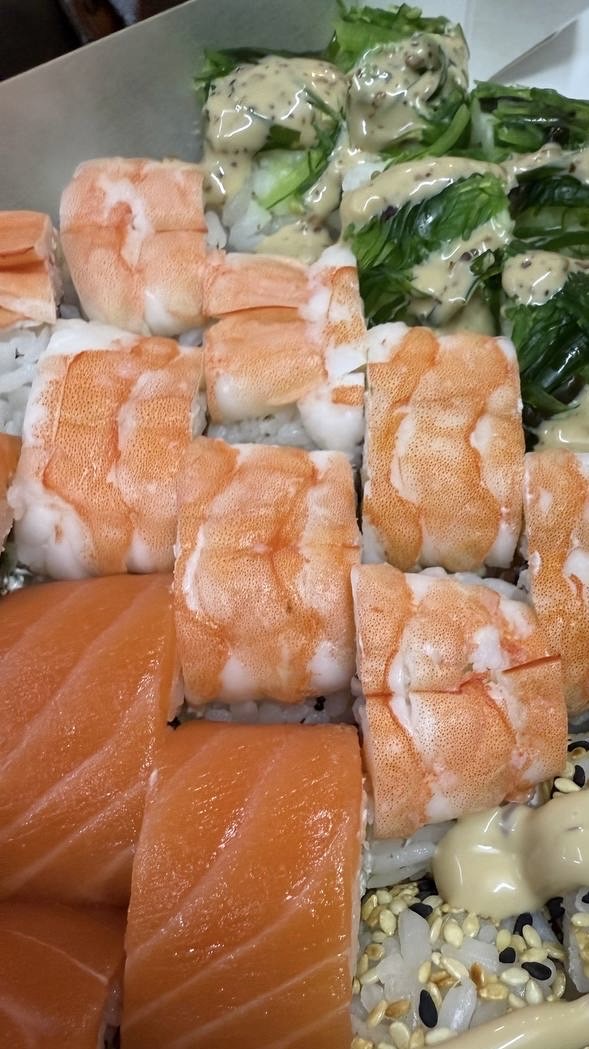 - "Ролл с лососем и манго в кунжуте": филе лосося, сливочный сыр, салат айсберг, манго, кунжут, кешью - 8 шт.