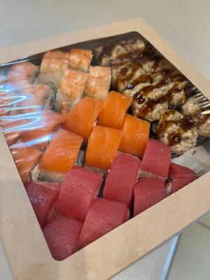 - "Брайтон": филе тунца, сливочный сыр, такуан, огурец, лук зеленый, соус пряный, соус терияки, орехи кешью - 8 шт.
