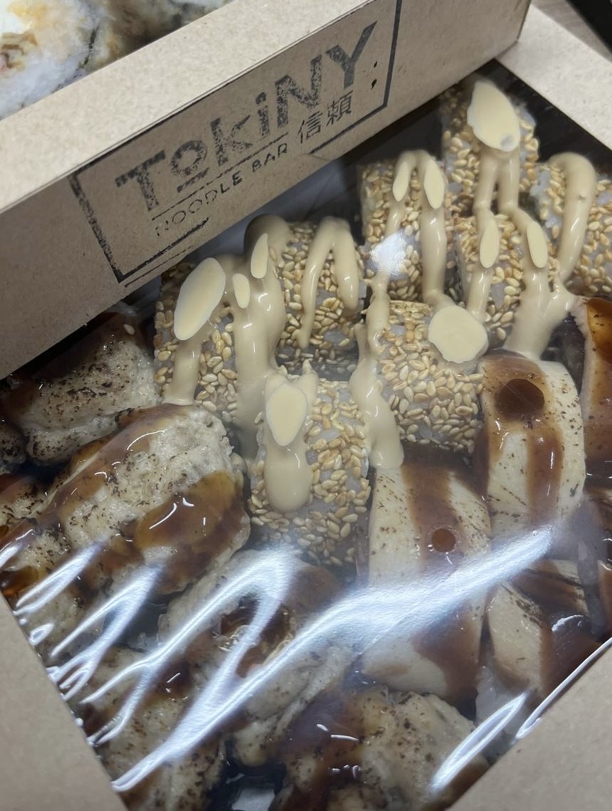 - "Дентон": бекон, овощи-гриль, сливочный сыр, омлет тамаго, соус терияки и соус спайси - 8 шт.