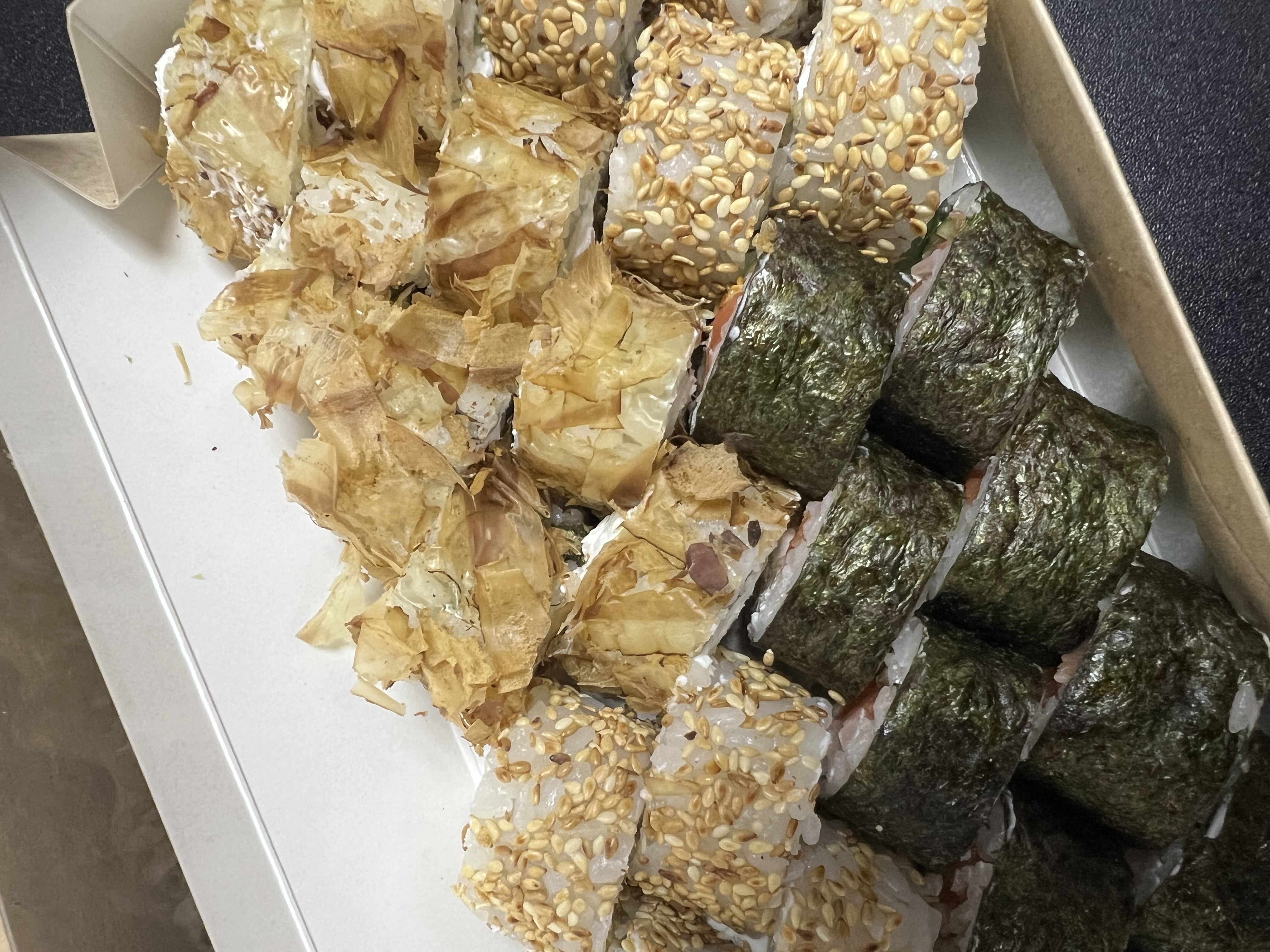 - "Бонито": филе лосося, огурец, сливочный сыр, стружка тунца - 8 шт.