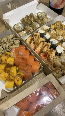 - "Ролл с лососем и манго в кунжуте": филе лосося, сливочный сыр, салат айсберг, манго, кунжут, кешью - 8 шт.