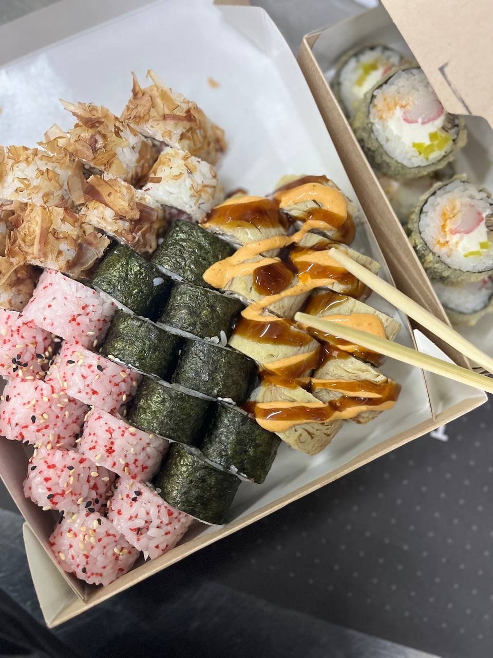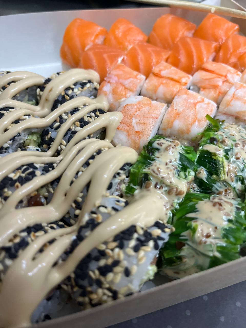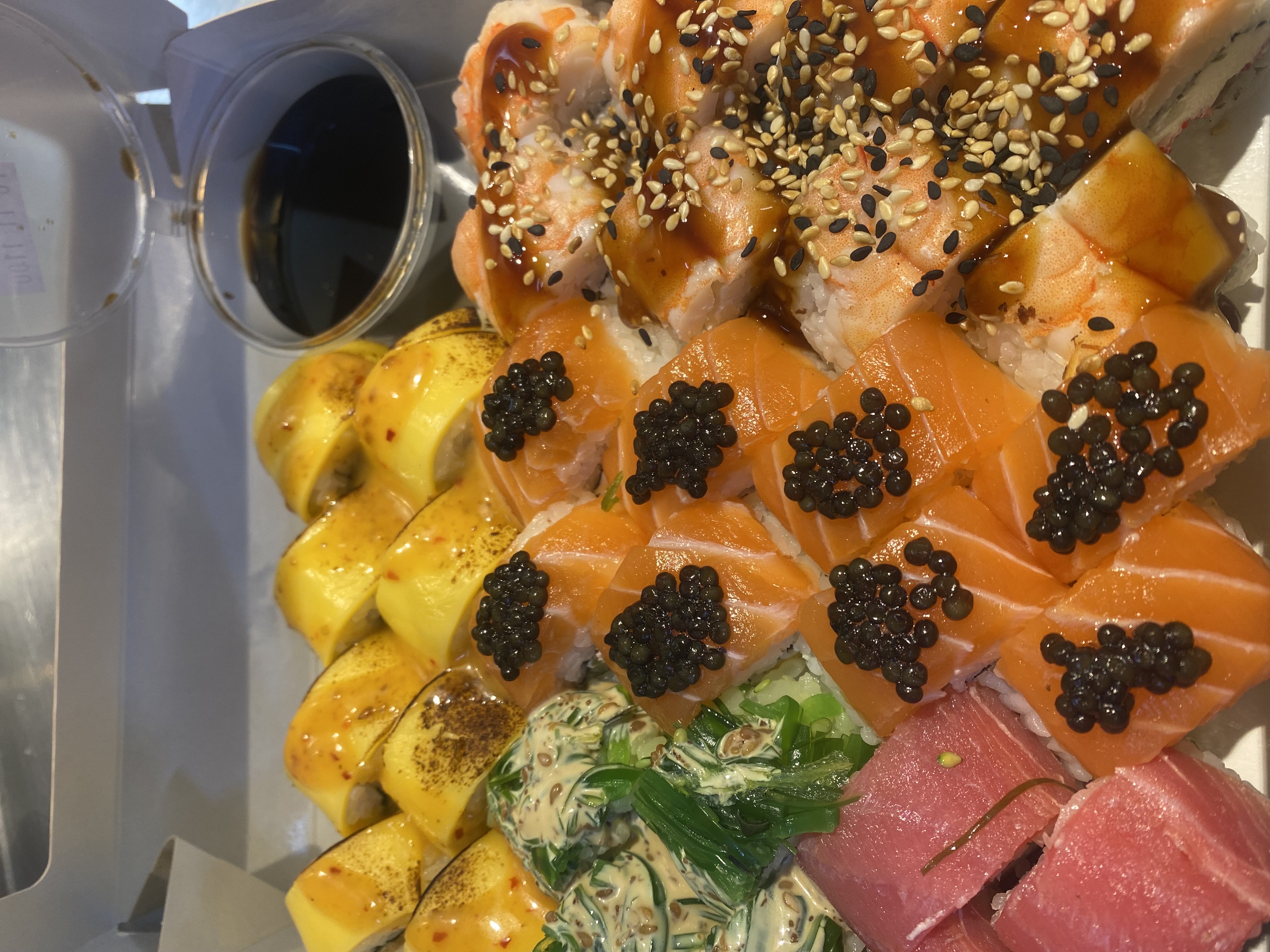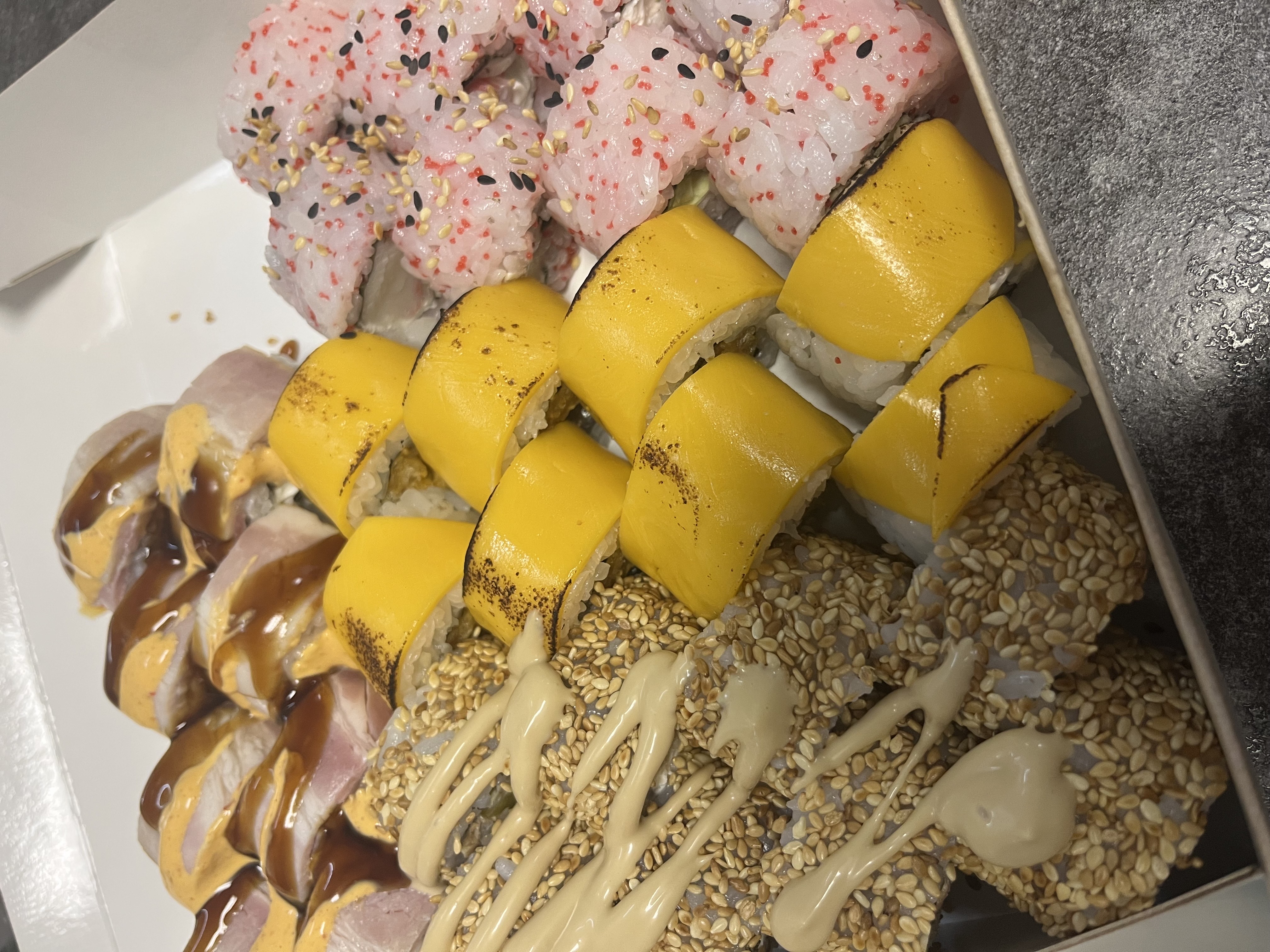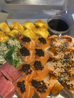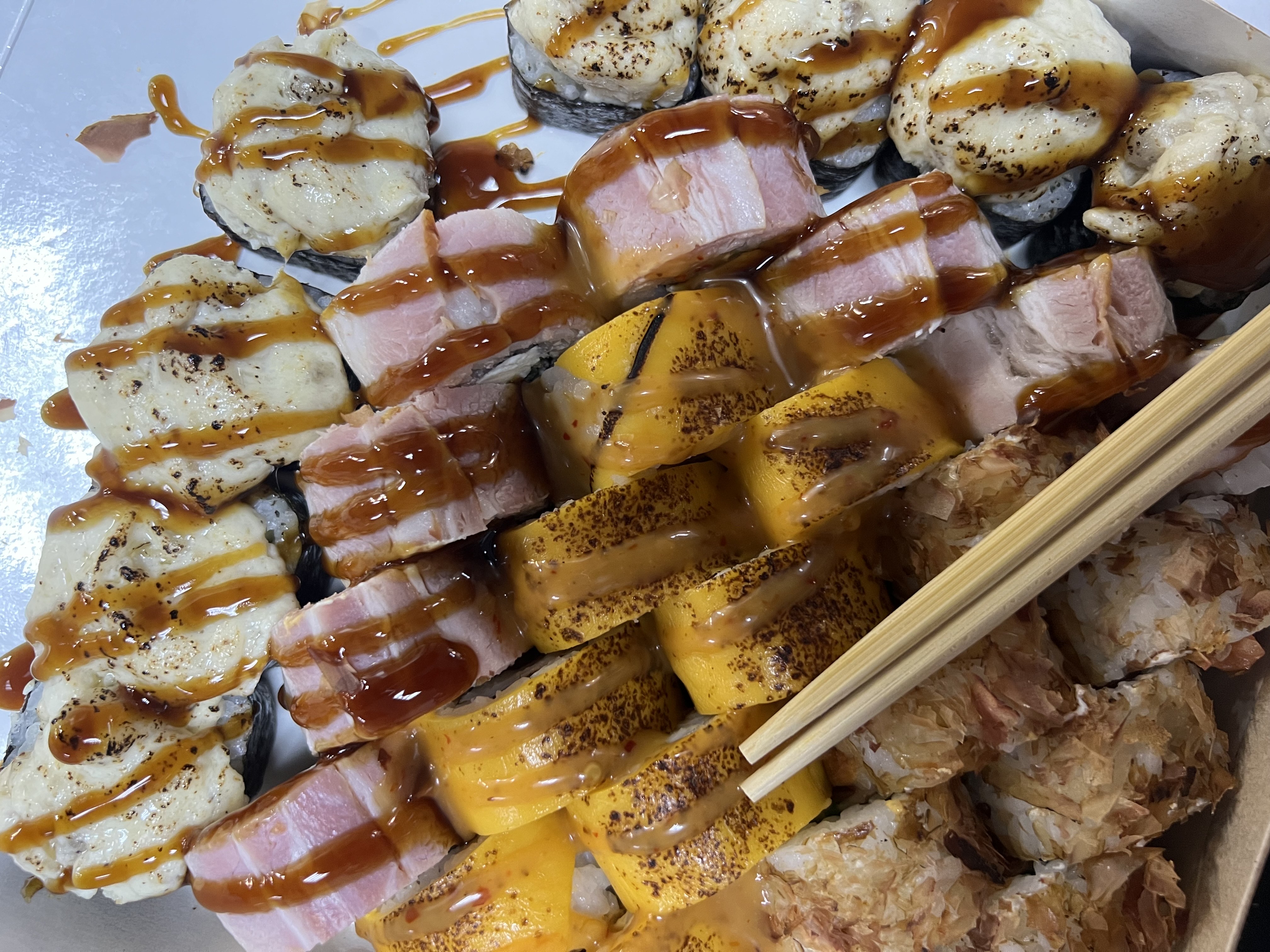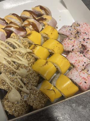 - "Манчестер": жареное филе лосося, такуан, сливочный сыр, омлет тамаго, соус лос-анджелес, кунжут - 8 шт.