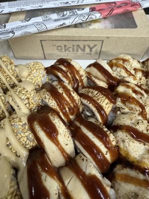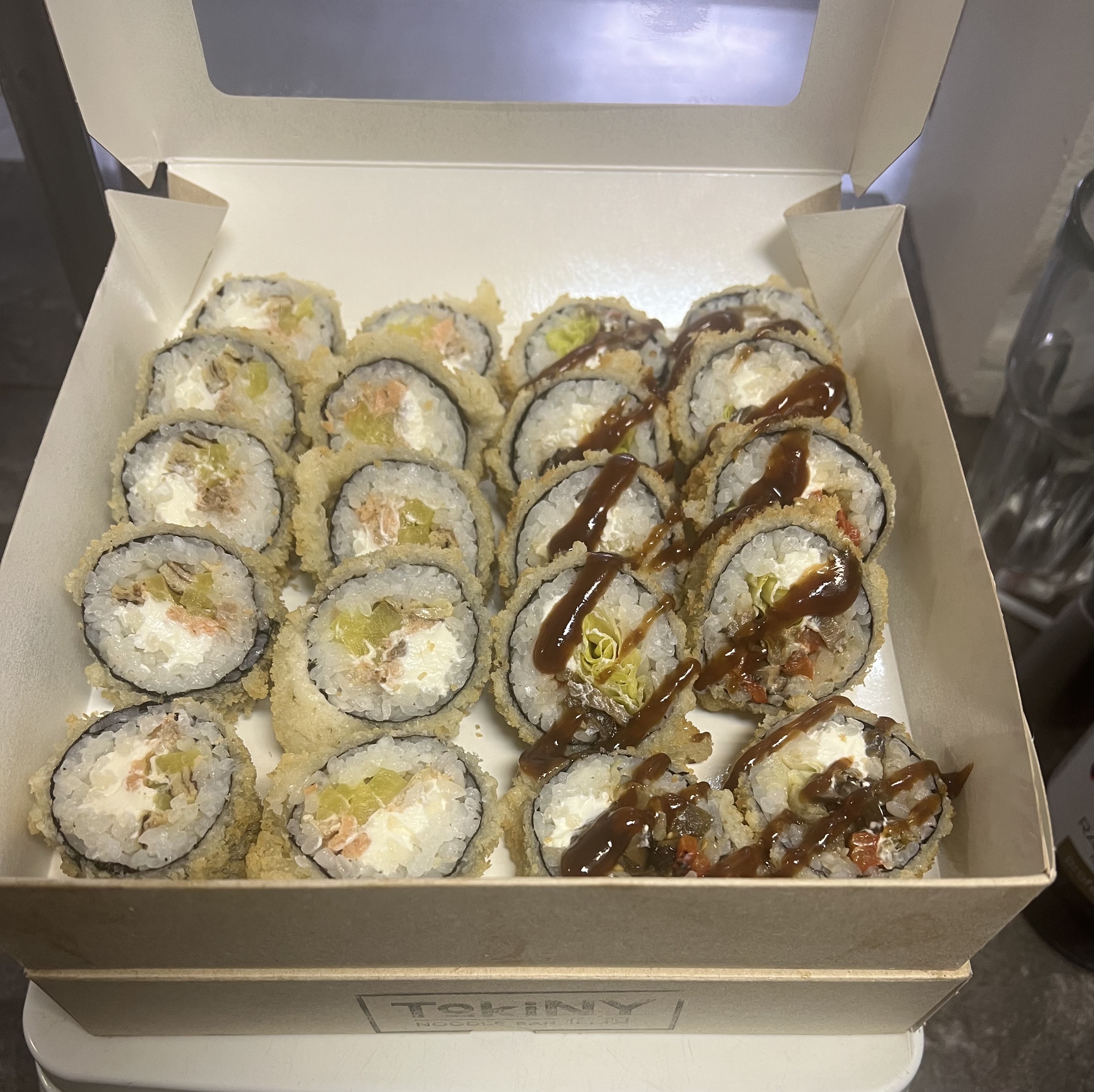 - "Балтимор" (острое): филе тунца, сыр чеддер, пряный соус, криспи - 8 шт.